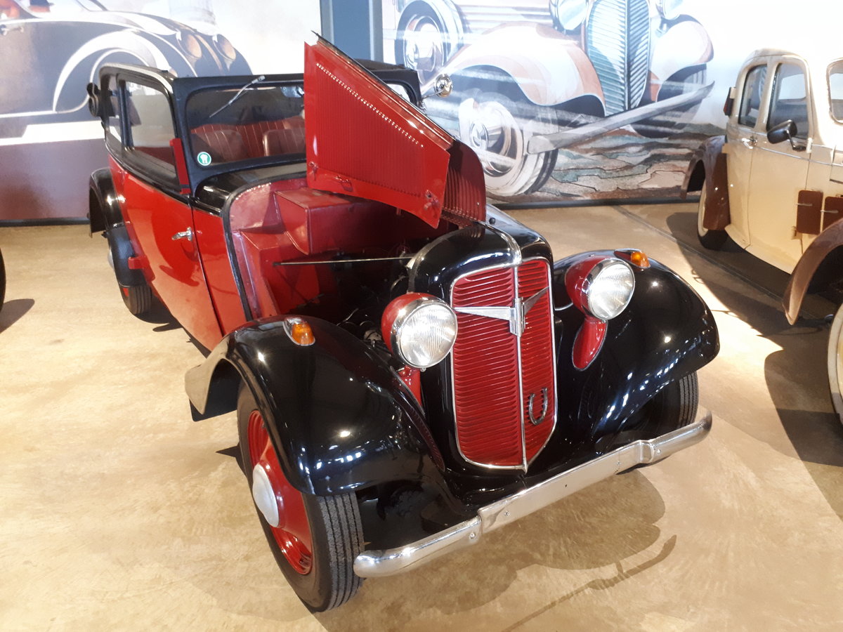 Adler Trumpf Junior Cabrio Limousine, gebaut von 1934 bis 1941. Das Modell wurde vom legendären Gustav Röhr konstruiert. Der Wagen war in etlichen Karosserieversionen lieferbar. Die Karosserien der Modelle Limousine und Cabrio Limousine wurden bei Ambi-Budd in Berlin gepresst. Eine solche Cabrio Limousine stand im Jahr 1936 mit RM 2950,00 in den Preislisten der Adler-Händler. Der Vierzylinderreihenmotor hat einen Hubraum von 995 cm³ und leistet 25 PS. Die Höchstgeschwindigkeit wurde mit 90 km/h angegeben. Zylinderhaus Bernkastel-Kues am 27.09.2018.
