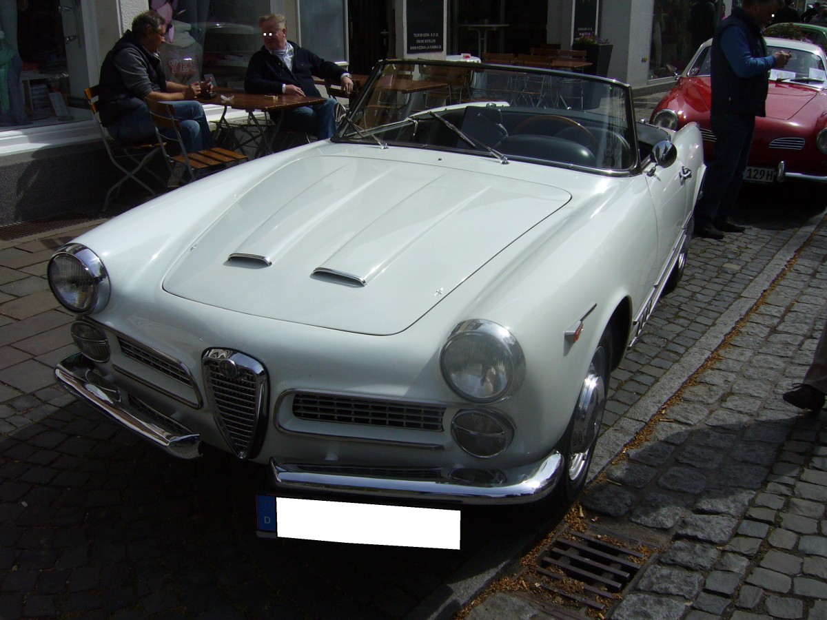 Alfa Romeo 2000 Spider. 1958 - 1961. Die 2000´er Modelle basierten auf den bereits 1950 vorgestellten 1900´er Modellen. Das hübsch gezeichnete Cabriolet wurde bei der Carozzeria Touring/Mailand produziert. Manko dieses Modelles waren die immer noch verbauten Trommelbremsen. Der 4-Zylinderreihenmotor leistet 105 PS aus 1975 cm³ Hubraum. 8. Kettwiger Oldtimerfrühling am 01.05.2015.