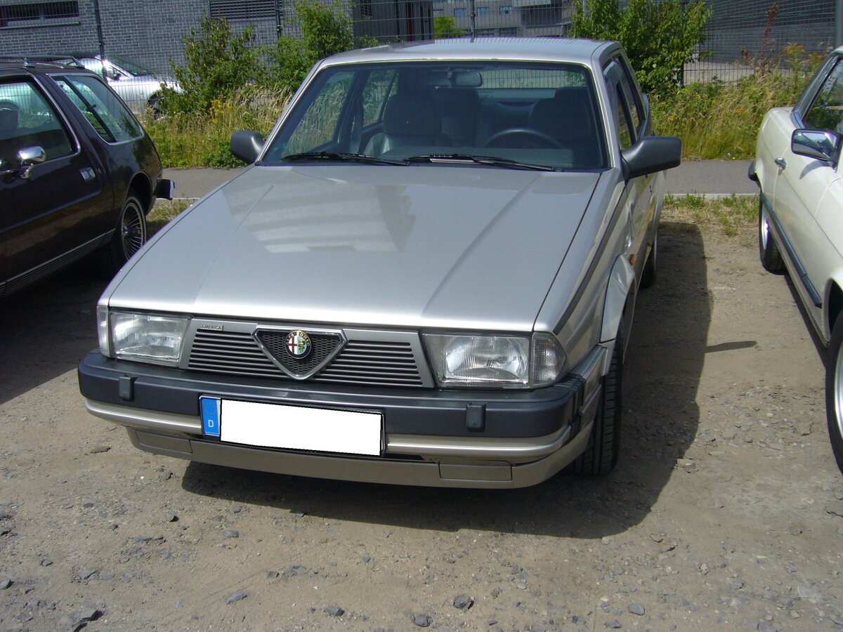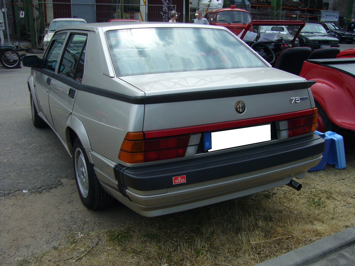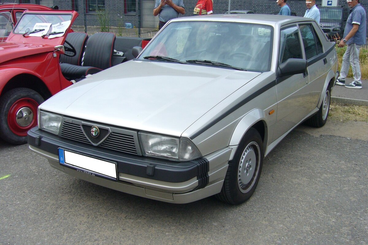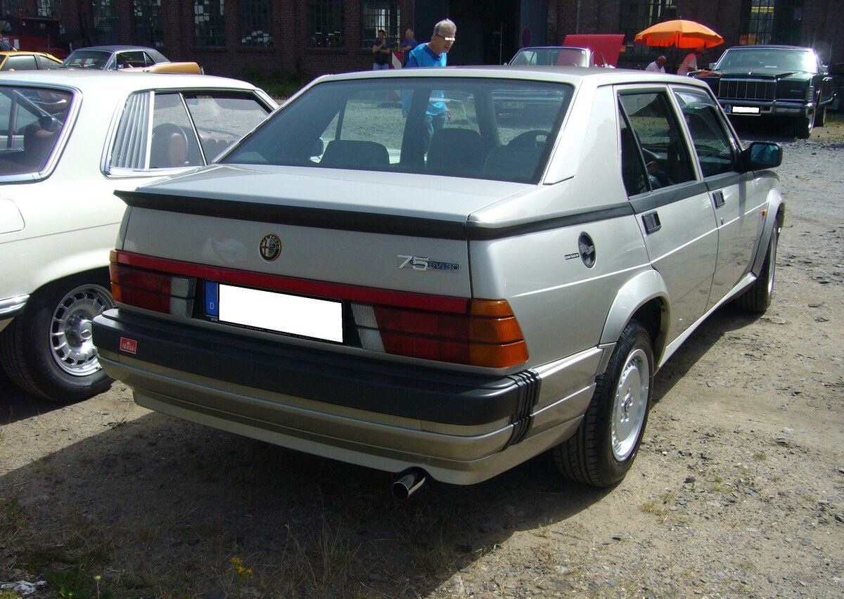 Alfa Romeo 75 3.0 V6 America, produziert in den Jahren von 1987 bis 1990. Der Alfa Romeo 75 wurde im Jahr 1985 zum 75´ten Geburtstag der Marke aus Mailand vorgestellt. Der Kunde konnte das Modell in etlichen Benzin- und Dieselmotorisierungen bestellen. Im August 1987 wurde das Spitzenmodell 3.0 V6 auf den Markt gebracht. Unter der Motorhaube verrichtet ein V6-Motor seinen Dienst, der aus einem Hubraum von 2959 cm³ 185 PS leistet. Oldtimertreffen an der "Alten Dreherei" in Mülheim an der Ruhr am 18.06.2023.