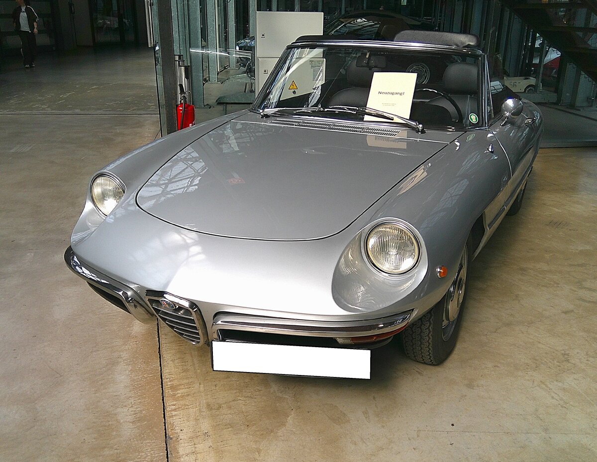 Alfa Romeo Duetto Spider, produziert von 1966 bis 1969. Werksintern hieß die Baureihe 105/115. Anfangs war der Wagen mit einem 1.6l Vierzylinderreihenmotor ausgerüstet. Ab 1967 wurde die Motorenpalette mit dem 1750 Veloce nach oben und mit dem 1300´er nach unten abgerundet. Hier wurde ein 1750 Veloce abgelichtet. Der Motor leistet 118 PS aus einem Hubraum von 1779 cm³. Besucherparkplatz der Düsseldorfer Classic Remise am 28.09.2021.