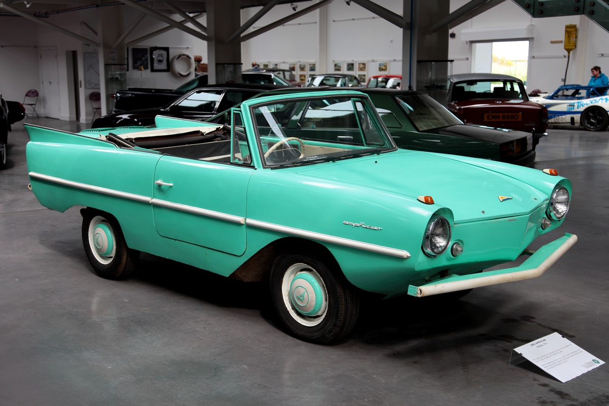 Amphicar Model 770, Baujahr 1965, im Isle of Man Motor Museum Jurby am 01.05.2018. Die zulässige Geschwindigkeit für dieses Fahrzeug wird zu Wasser mit 7mph und zu Land mit 70mph angegeben.