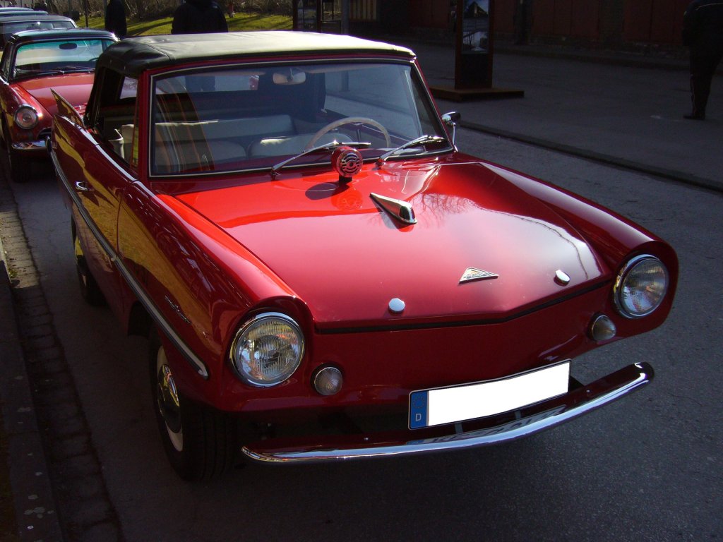 Amphicar 770. 1961 - 1968. Der 770 war eine Kostruktion des Schwimmwagenpionieres Hanns Trippel aus Groß-Umstadt im Odenwald. Der Motor im 770 stammt vom englischen Triumph Herald und leistet mit seinem 4-Zylinderreihenmotor 38,3 PS aus 1.147 cm³ Hubraum. Es sollen ca. 3000 Amphicar 770 produziert worden sein, die größtenteils in die USA exportiert worden sind. Oldtimertreffen Kokerei Zollverein am 07.04.2013.