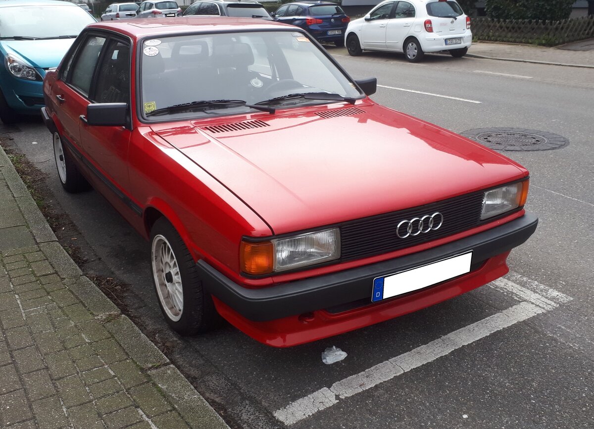 Audi 80 B2 Typ 81 GTE. Im September 1978 erschien der "neue" Audi 80 B2. Die Mechanik stammte vom Vorgänger. Er hatte aber einen längeren Radstand, eine breitere Spur und eine größere Karosserie. Das gezeigte, sportlichere GTE-Modell, wurde nur in den Jahren 1983 und 1984 produziert. Der Vierzylinderreihenmotor hat einen Hubraum von 1781 cm³ und leistet mittels einer mechanischen Einspritzpumpe der Firma Bosch 112 PS. Bei einem Verbrauch von 11 Litern Super auf 100 Kilometer war eine Höchstgeschwindigkeit von 184 km/h erreichbar. Mülheim an der Ruhr am 26.02.2024.