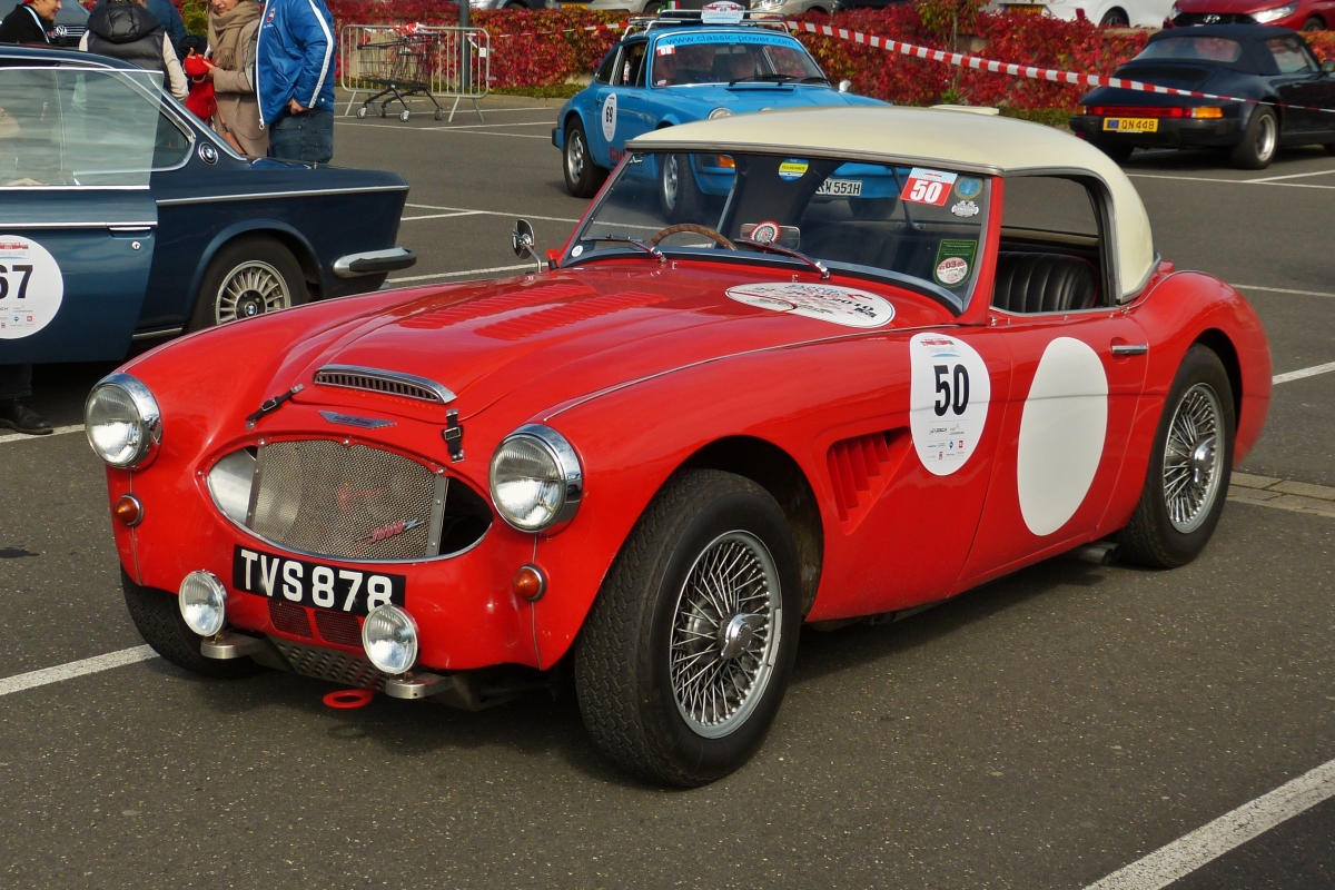 Austin Healey BT 7 Rallye, Bj 1959, Motor 2,9 Ltr, 6 Zyl, 220 Ps, wartet das Ende der Pause auf dem Parkplatz ab. 01.10.2021