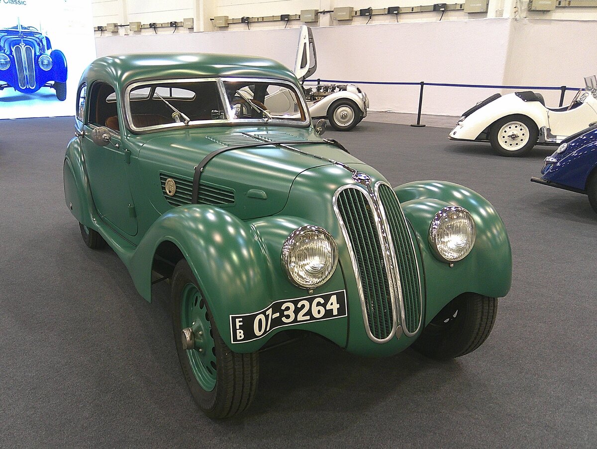 BMW 328 Zimber-Coupe. Ursprünglich war dieses Auto ein BMW 328 Roadster aus dem Jahr 1938, der WW2 überlebt hat. Zwischen 1949 und 1952 baute der Sägewerksbesitzer und leidenschaftliche Motorsportenthusiast Adolf Zimber aus der Breisgau-Gemeinde Bad Krozingen das Auto zu einem Coupe um, um das Auto komfortabler für seine anstehende Hochzeitsreise nutzen zu können. Außerdem wurde das Coupe bei etlichen Bergrennen auf dem Schauinsland bei Freiburg eingesetzt. Während die meisten BMW 328 als Roadster oder mit Werkskarosserien (wie dem Kamm-Coupé oder Touring-Coupé) bekannt sind, stellt das Zimber-Coupé eine individuelle Sonderkarosserie dar. Der Sechszylinderreihenmotor mit einem Hubraum von 1971 cm³ leistet 80 PS und kann den Wagen auf eine Höchstgeschwindigkeit von 150 km/h beschleunigen. Retro Classics in Essen am 09.04.2026. Michael H.