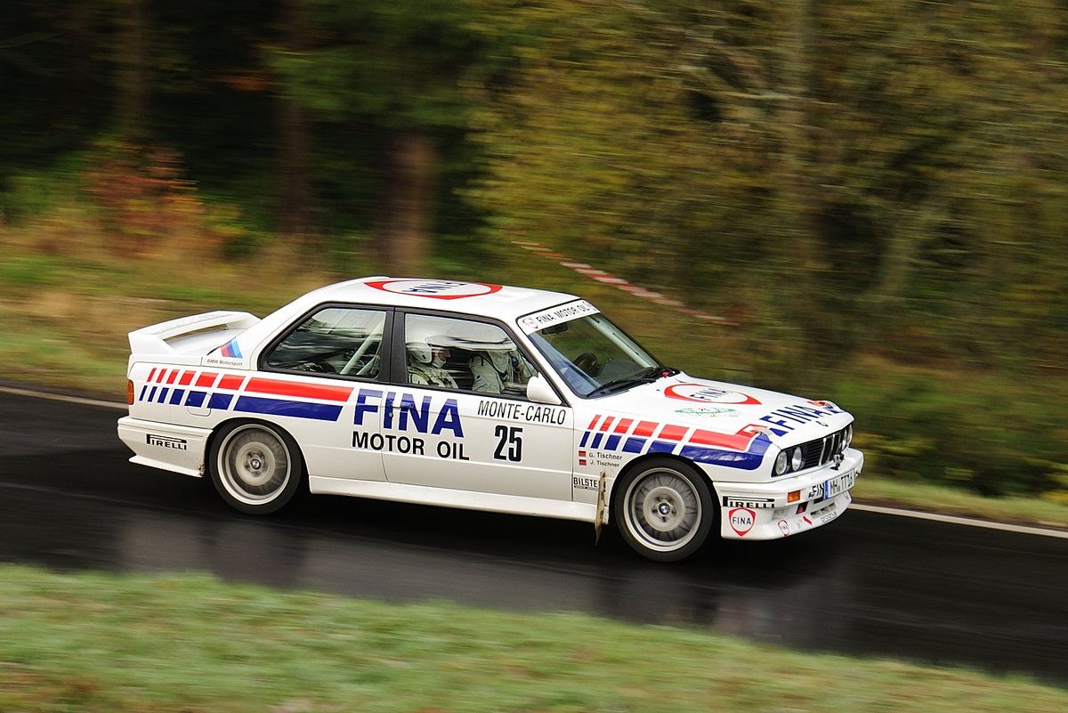 BMW M3 E30, Jonas & Gotthard Tischner mit der Startnummer 25 bei der Youngtimer Rallye Köln Ahrweiler 12.11.2016, Morgens auf teils noch glaten Asphalt.
