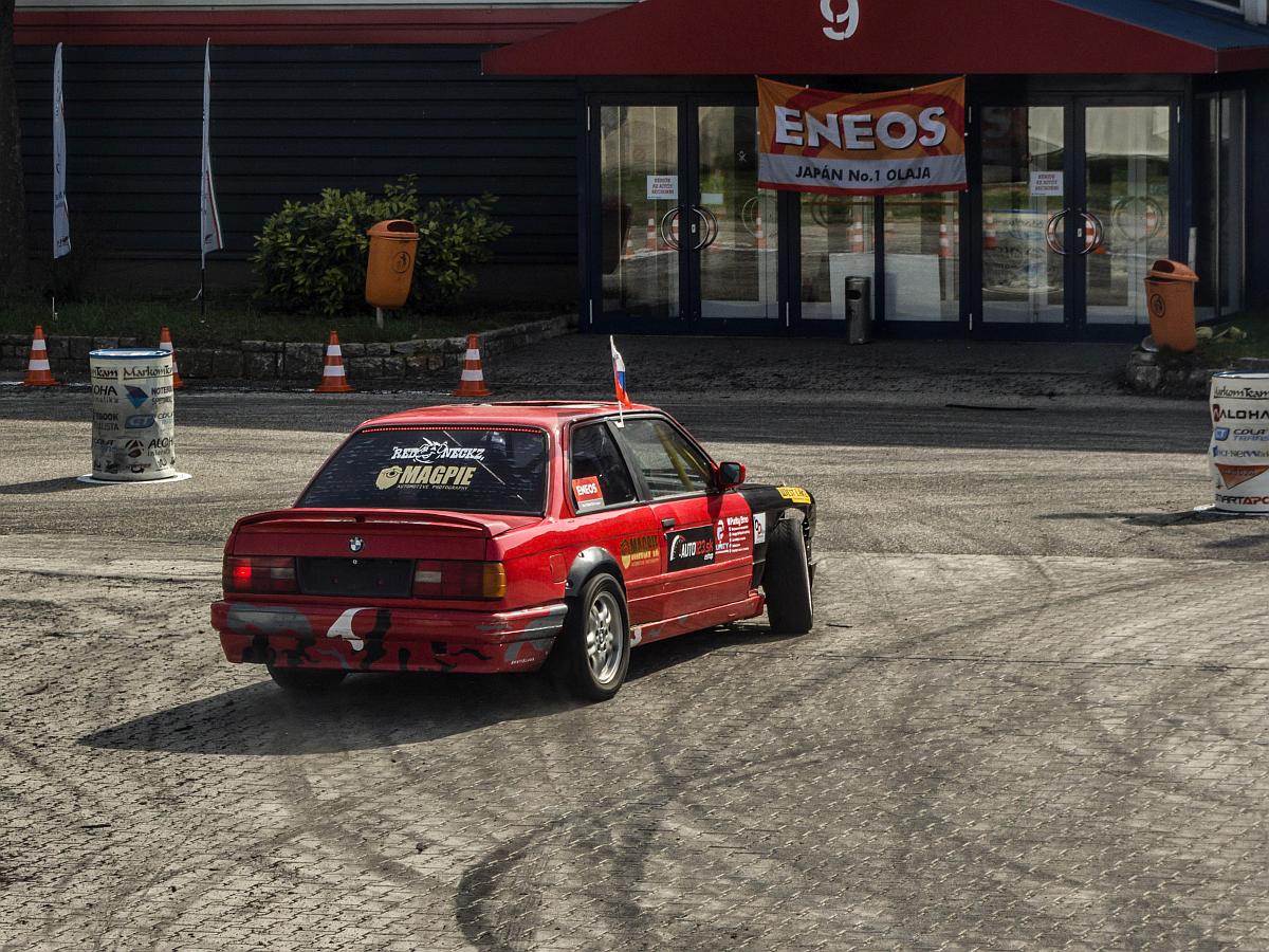 Driftender BMW E30, fotografiert auf der Automobil und Tuning Show, März 2017.