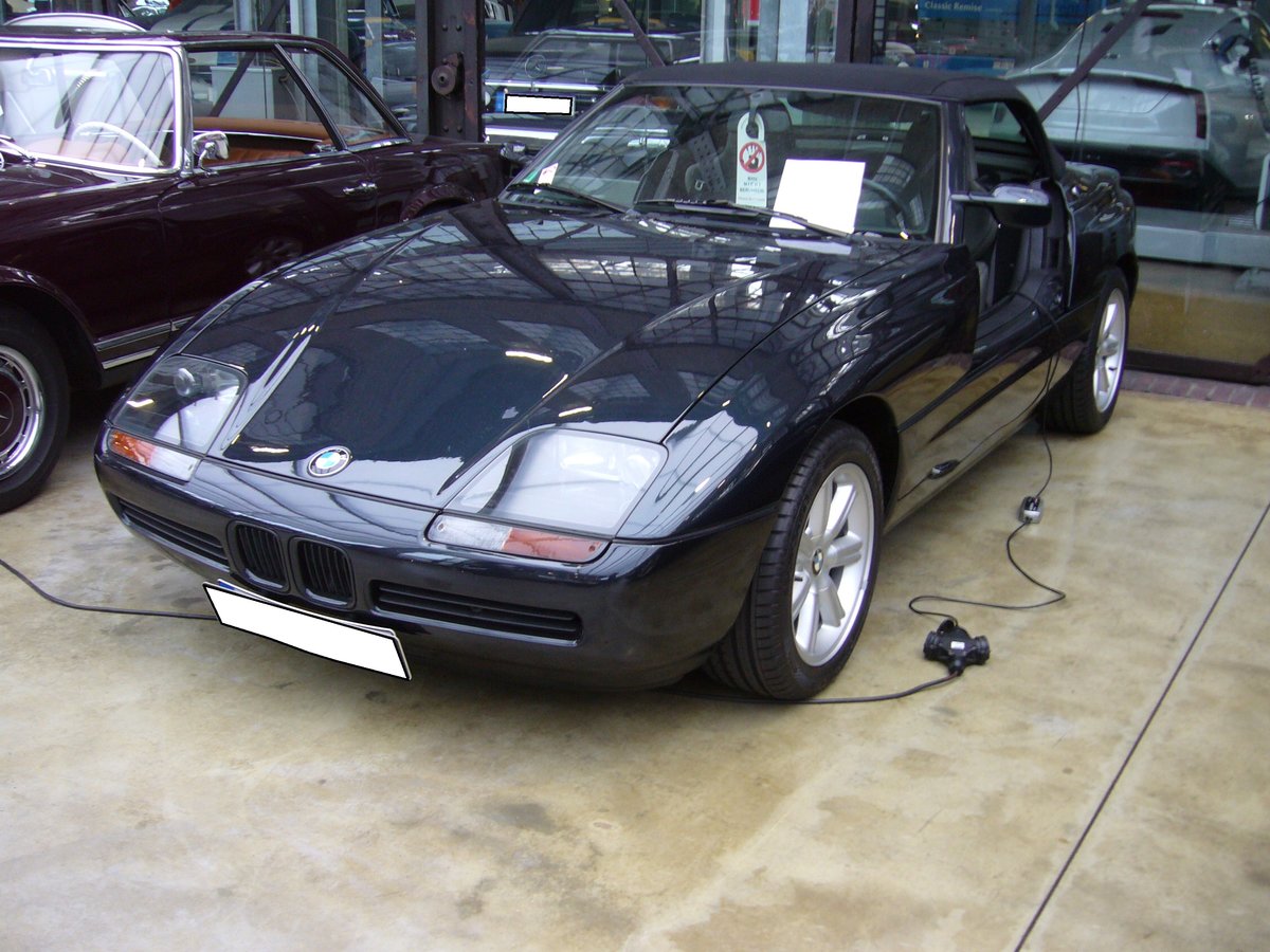 BMW Z1. 1989 - 1991. Von diesem Modell wurden in der dreijährigen Produktionszeit genau 8000 Einheiten produziert. Dieser, im Farbton Traumschwarz lackierte Z1, entstammt dem letzten Produktionsjahr. Angetrieben wird der Sportwagen von einem 6-Zylinderreihenmotor, der aus 2494 cm³ Hubraum 170 PS leistet. Die Höchstgeschwindigkeit liegt bei 225 km/h. Classic Remise Düsseldorf am 19.12.2017.