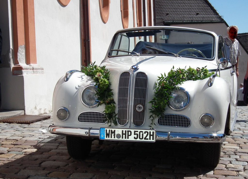 BMW 502 Cabrio als Brautkutsche von dem Kirchenportal von Kloster Andechs, Juli 2010