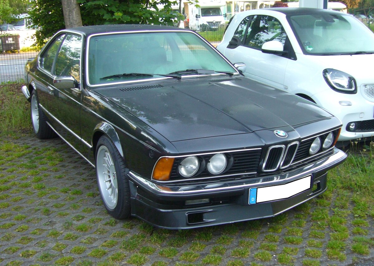 BMW E24 635 CSi, gebaut in den Jahren von 1978 bis 1987. Der abgelichtete E24 aus dem Jahr 1979 ist im Farbton diamantschwarz lackiert. Der, mit einer rechtsseitigen Neigung von 30 Grad, verbaute Sechszylinderreihenmotor hat einen Hubraum von 3453 cm³ und leistet 218 PS. Die Höchstgeschwindigkeit wurde vom Werk mit 225 Km/h und der Verbrauch mit 15 Liter Superbenzin auf 100 Kilometer angegeben. Mülheim an der Ruhr-Saarn am 12.05.2024.