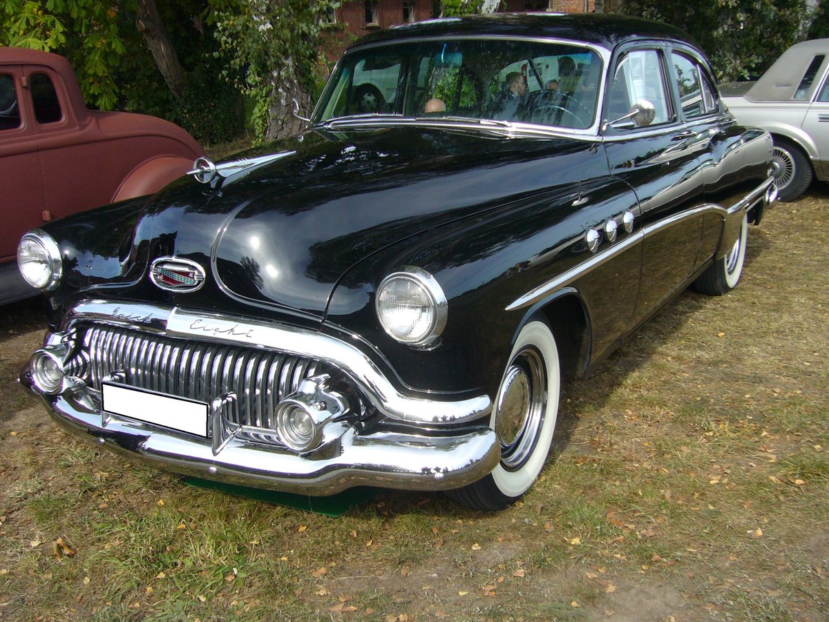 Buick Special 40 DeLuxe fourdoor Sedan des Modelljahres 1951. Im Jahr 1951 waren die Autos der Modellreihe Special 40 die Basismodelle in der Buick Modellpalette. Darüber rangierten die Baureihen Super 50 und das Topmodell Roadmaster 70. Von diesem Modell in der Version Special 40 DeLuxe fourdoor Sedan verkaufte Buick 1951 87.848 Autos zum Preis ab US$ 2185,00. Der im Farbton carlsbad black lackierte Buick hat einen Achtzylinderreihenmotor der aus einem Hubraum von 263 cui (4310 cm³) und leistet 128 PS. Die Kraftübertragung erfolgt mittels einer Dynaflow-Getriebeautomatic auf die Hinterachse. Oldtimertreffen des Oldtimerclubs Schermbeck am 22.09.2019 in Lühlerheim.