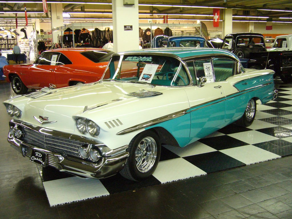 Chevrolet Biscayne four door Sedan des Jahrganges 1958. Die Biscayne Baureihe war die mittlere Ausstattungsvariante des 1958´er Chevroletjahrganges. Darunter war die Modellreihe Del Ray und darüber die Modellreihe Bel Air angesiedelt. Es standen ein 6-Zylinderreihenmotor mit 145 PS oder zwei V8-motoren mit 4.6 l oder 5.7 l Hubraum zur Verfügung. Die Leistung betrug wahlweise 185, 230, 250, 280 oder 290 PS. Die Farbkombination des abgelichteten Autos nannte sich larkspurblue/ivory. Essen Motorshow 30.11.2010.