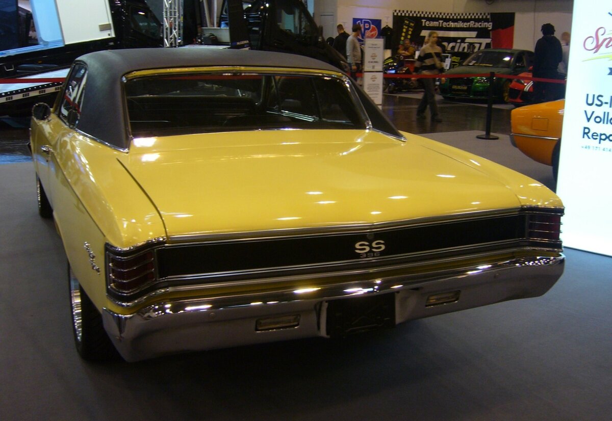 Heckansicht eines Chevrolet Chevelle Malibu Coupe SS396 in der Farbkombination butternut yellow/black aus dem Jahr 1967. Essen Motorshow am 06.12.2023.