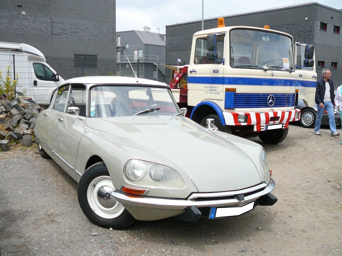 Citroen DS19. Die DS wurde auf dem Pariser Salon 1955 vorgestellt und war dort der absolute Publikumsmagnet. Die gezeigte DS wurde nach 1967 produziert. Dieses an den verbauten Doppelscheinwerfern erkenntlich. Angetrieben wird das Auto mit der legendären, hydropneumatischen Federung von einem Vierzylinderreihenmotor mit einem Hubraum von 1985 cm³ und einer Leistung von 90 PS. Oldtimertreffen an der "Alten Dreherei" in Mülheim an der Ruhr im Juni 2015.