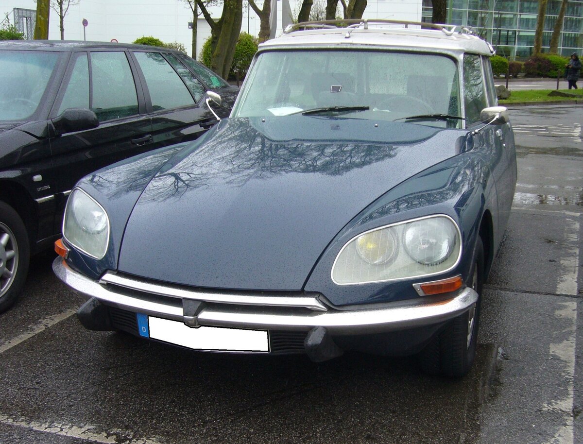 Citroen DS20 Break, also ein recht seltenes Kombimodell, vermutlich aus dem vorletzten Modelljahr 1974. Die DS-Baureihe wurde auf dem Pariser Salon des Jahres 1955 vorgestellt und war dort der absolute Publikumsmagnet. Von 1955 bis 1968 nannte sich das Modell DS19. Nach den Werksferien 1968 wurde aus der DS19 die DS20. Angetrieben wird das Auto, mit der legendären hydropneumatischen Federung, von einem Vierzylinderreihenmotor mit einem Hubraum von 1985 cm³ und einer Leistung von anfänglich 90 PS bzw. ab dem Modelljahr 1971 99 PS. Die Höchstgeschwindigkeit gab Citroen mit 169 km/h an. Besucherparkplatz der Techno Classica Essen am 03.04.2024.