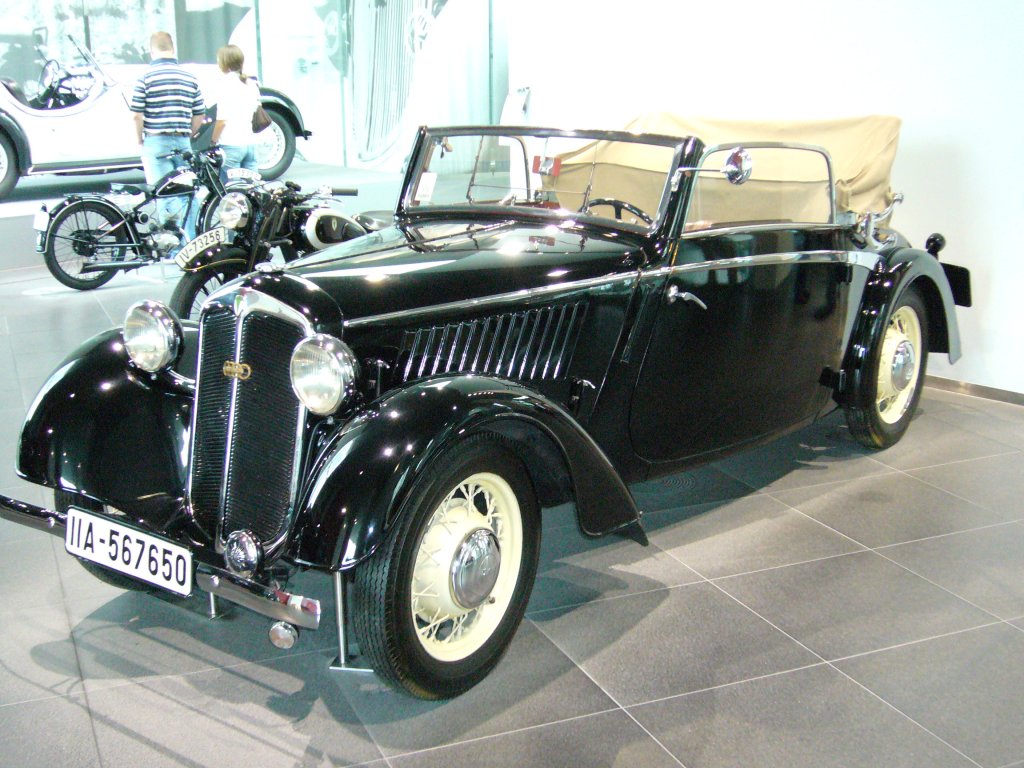 DKW F5 Front Luxus Cabriolet. 1935-1938. Das abgelichtete Fahrzeug wurde 1937 gebaut. Es ist eines von 3.085 gebauten Exemplaren. Die Karosserie mit dem Holzrahmen und der Blechverkleidung wurde bei Horch produziert. Der 684 cm³ 2-Zylinder-Zweitakt-Reihenmotor leistete 20 PS. Audi Museum.