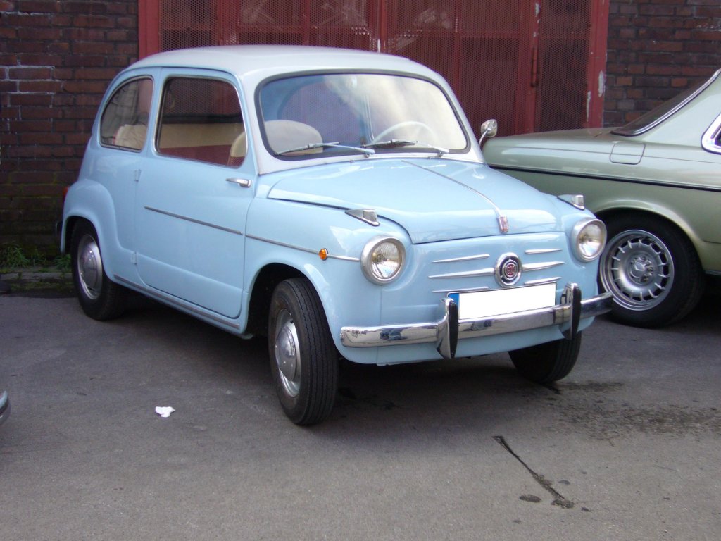 Fiat 600 Berlina. 1955 -1960. Der Seicento wurde auf dem Genfer Salon 1955 vorgestellt. Ringsum Einzelradaufhängung und Platz für vier Personen begründeten den Erfolg dieses Autos. Mit vielen Facelifts wurde der Wagen bis 1969 produziert. Es gab Lizenzproduktion bei Zastava in Yugoslawien und Fiat Argentinia. Die Modelle der ersten Baureihe, wie abgelichtet waren mit einem wassergekühlten 4-Zylinderreihenmotor versehen. Dieser leistet 19 PS aus 633 cm³ Hubraum. Oldtimertreffen Kokerei Zollverein am 07.10.2012.