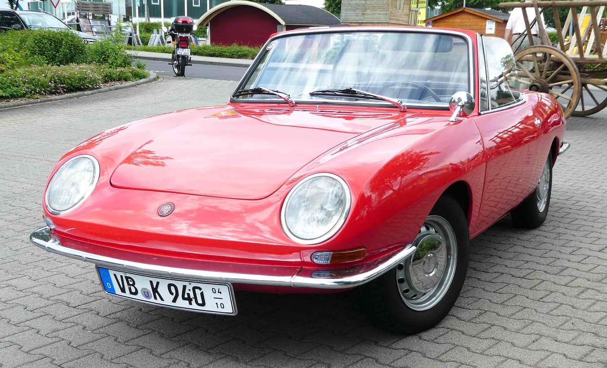 =Fiat 850 Spider steht bei der Traktorenausstellung "Ahle Bulldogge us Angeschbach oh Lannehuse" in Angersbach im Juni 2018