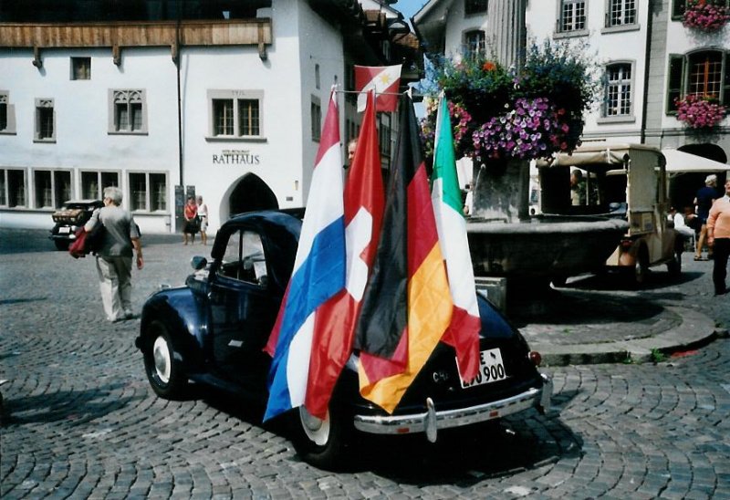 Fiat Topolino BE 290'900 am 31. August 2008 in Thun am Topolino-Treffen (geschmückt mit den Fahnen der Teilnehmerstaaten)