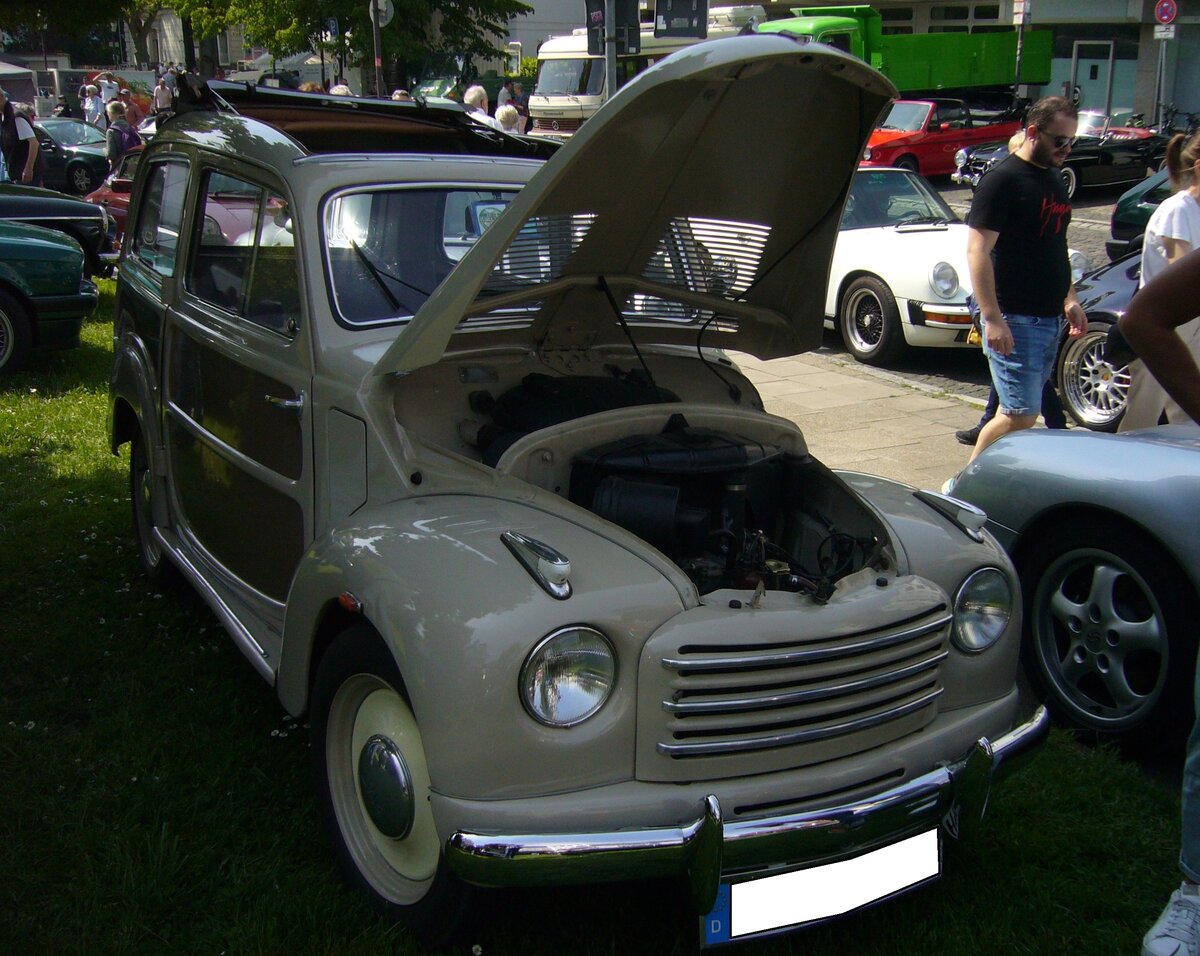 Fiat 500C "Topolino" Belvedere aus dem Jahr 1954. Dieser "Topolino Belvedere" wurde erstmalig im September 1954 im italienischen Savona/Ligurien zugelassen. Er ist jetzt in vierter Hand und hat mit seinen fast 70 Jahren erst rund 82.000 Kilometer zurück gelegt. Angetrieben wird das "Mäuschen" von einem wassergekühlten Vierzylinderreihenmotor. Dieser hat einen Hubraum von 565 cm³ und leistet runde 18 PS. Bei einer Geschwindigkeit von 80 km/h hört die Tachonadel allerdings auf, zu klettern. Aber das ist meines Erachtens für einen fast 70-jährigen in Ordnung. 16. Oldtimertreffen des ACK am 01.05.2024 in Essen-Kettwig.