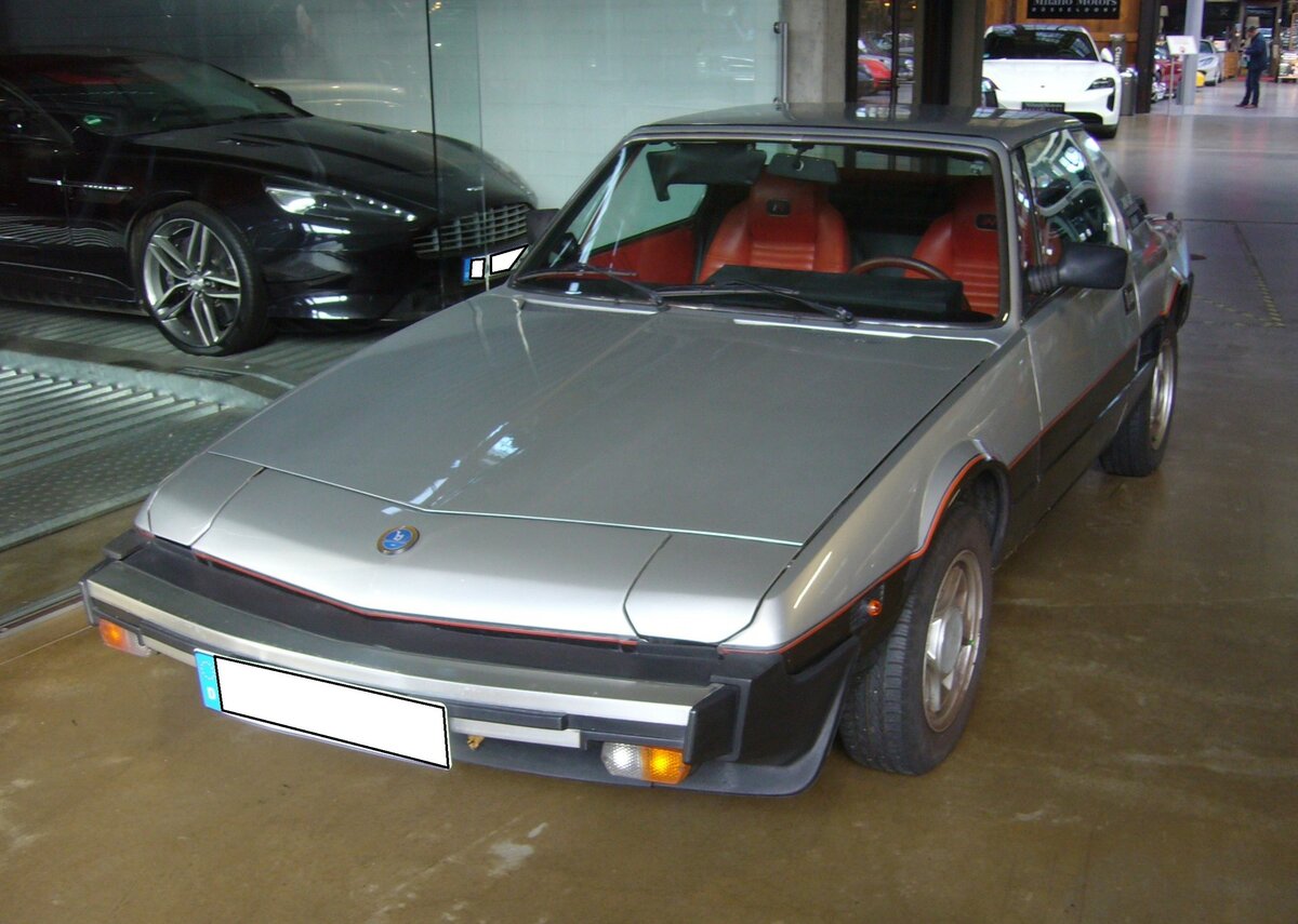 Fiat X1/9 fivespeed im Farbton silbermetallic 656, produziert von 1978 bis 1990. Der X1/9 wurde bereits im Frühjahr 1972 vorgestellt. Er basierte auf dem "Millionenseller" Fiat 128. Bei seiner Vorstellung wurde der Wagen von einem 1.3l Motor mit 75 PS angetrieben. Ab 1978 wurde der 1.5l Motor des Ritmo mit 85 PS verbaut. Seit diesem Zeitpunkt erhielt das Auto den Zusatz five speed. Ab dem Jahr 1982 wurde der keilförmige, zweisitzige Sportwagen bei Bertone produziert. Classic Remise Düsseldorf am 30.11.2023.
