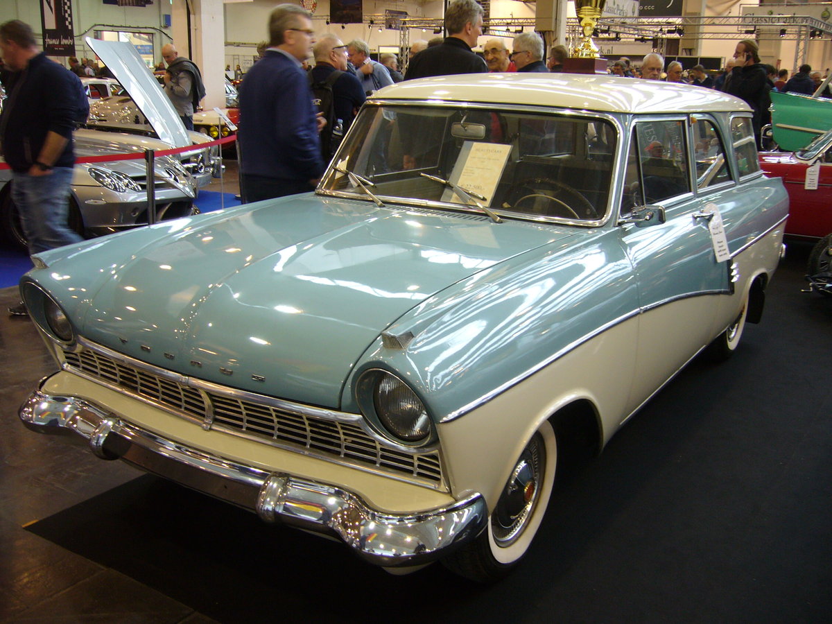 Ford Taunus P2 17M de Luxe Kombi. 1957 - 1960. Während der vierjährigen Bauzeit wurde 45.468 Kombimodelle des Typ 2 produziert. Der abgelichtete Wagen wurde nach Dänemark erst ausgeliefert. In Deutschland war für ein solches Fahrzeug ein Kaufpreis von mindestens DM 7.730,00 fällig. Der 4-Zylinderreihenmotor hat einen Hubraum von 1698 cm³ und leistet 60 PS. Techno Classica Essen am 22.03.2018.