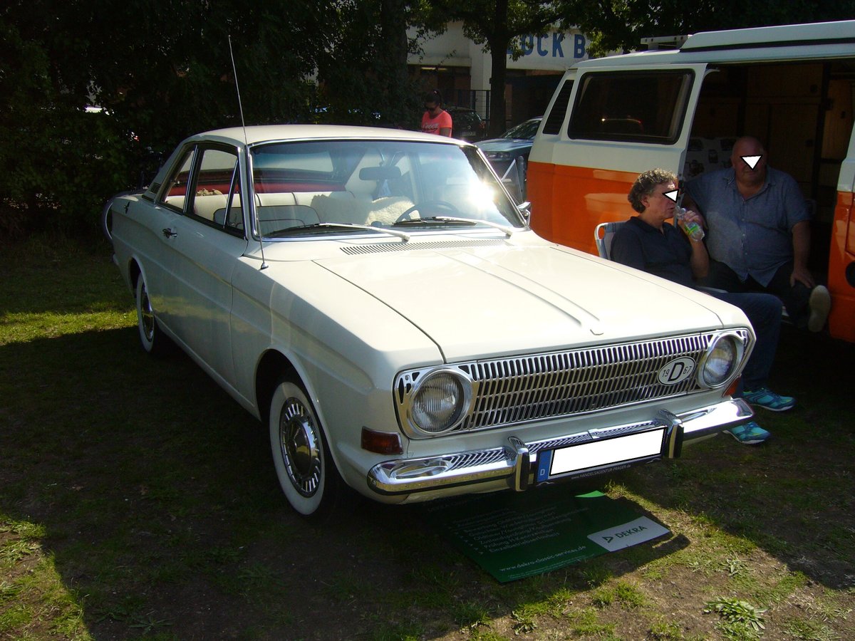 Ford Taunus P6 12M Coupe, gebaut von 1966 bis 1970. Der 12M (das M steht für Meisterstück) war in drei Leistungsstufen lieferbar. Der V4-motor leistet entweder 45 PS aus einem Hubraum von 1183 cm³ oder, je nach Vergaserbestückung 50 PS oder 53 PS aus einem Hubraum von 1305 cm³. Oldtimertreffen "Dreieckswiese" in Duisburg-Wedau am 25.06.2019.