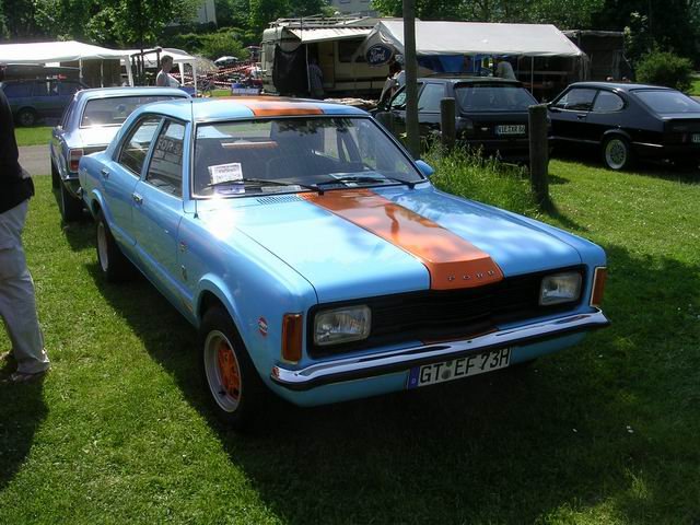 Ford Taunus TC Coupe 2.0 in der sportlichen GT-Ausstattung, gebaut von 1970 bis 1975. Das Coupe wurde 1973 erstmalig zugelassen. Unter der Motorhaube mit der  Knudsen-Nase  verrichtet ein V6-Motor seinen Dienst, der aus einem Hubraum von 1998 cm³ 90 PS leistet. Die Höchstgeschwindigkeit gaben die Kölner mit 163 km/h an. 11. Oldtimertreffen des AMC Duisburg auf dem Parkplatz des Landschaftspark Duisburg Nord am 24.08.2025.