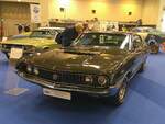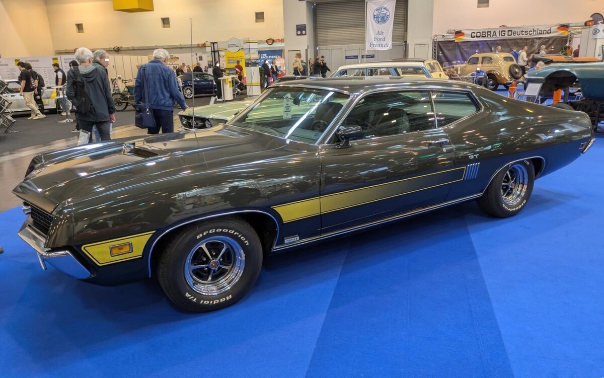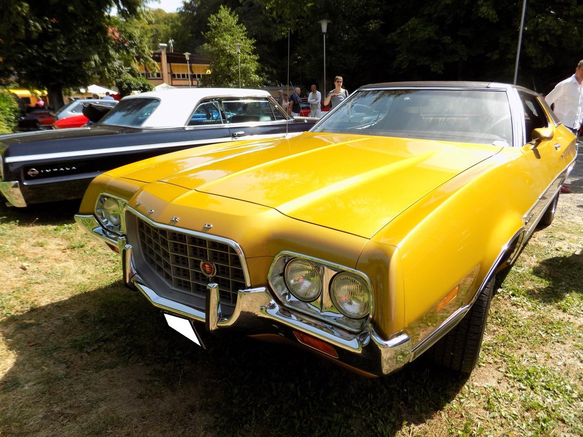 Ford Gran Torino Coupe des Modelljahres 1972. Die Torino Reihe wurde von 1972 bis 1976 produziert. In den Jahren 1972 und 1973 trugen die Modelle noch die sogenannte Knudsen-Nase, wie wir sie auch vom Ford Taunus TC kennen, an Kühlergrill und Motorhaube. Bei der Motorisierung konnte man in diesem Modelljahrgang zwischen einem Sechszylinderreihenmotor mit 4.096 cm³ und einer Leistung von 98 PS und fünf verschiedenen V8-motoren wählen. Der abgelichtete Gran Torino ist im Farbton medium bright yellow lackiert. Oldtimertreffen "Schwarzwaldhaus" in Mettmann am 12.08.2018.