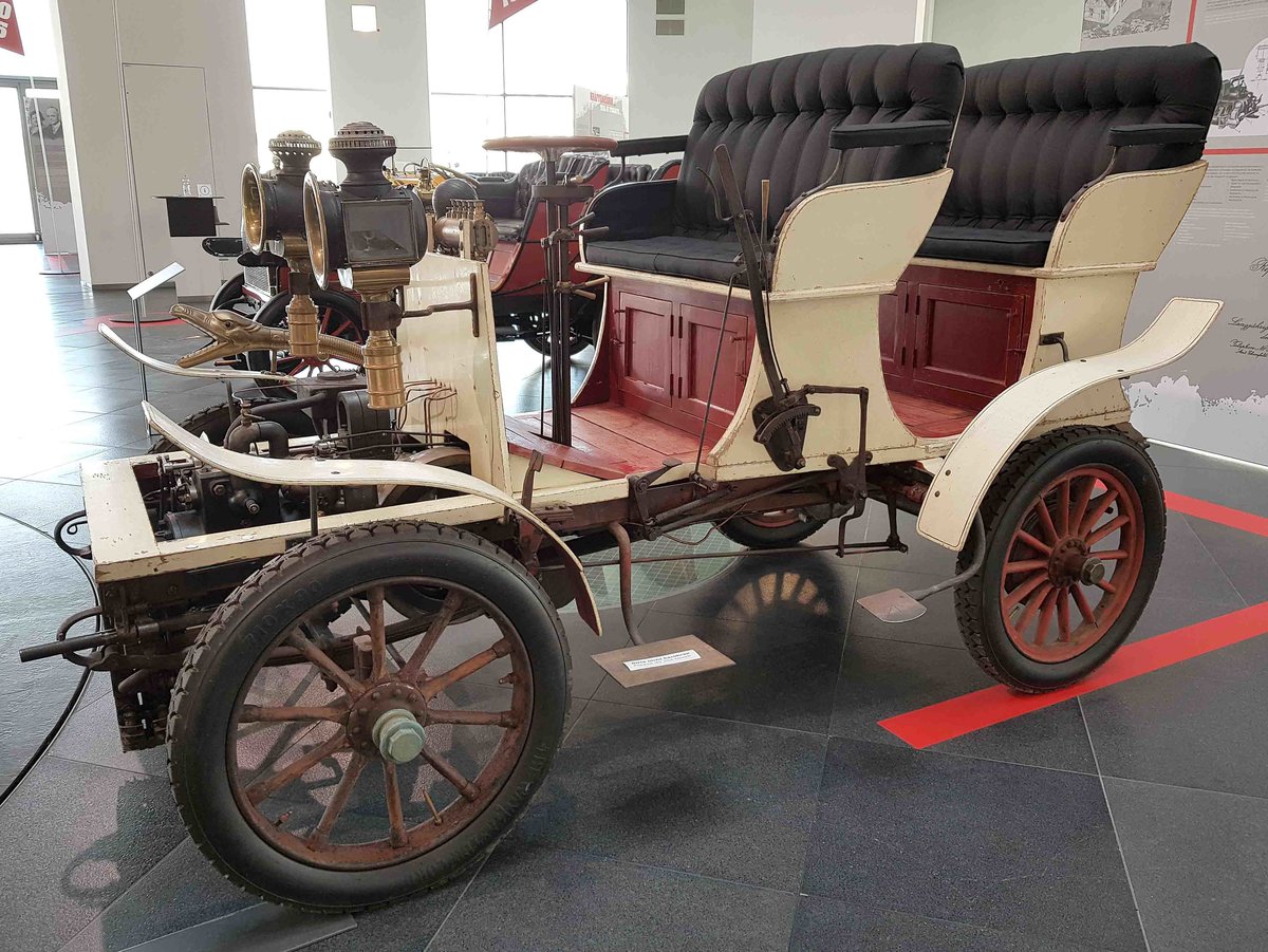 =Horch Modell 1 Pheaton, eine originalgetreue Nachfertigung des alten Horch aus dem Jahr 1901. Das gezeigte Fahrzeug wurde 2018 fertiggestellt und ist voll fahrfähig. Der Motor hat 1600 ccm und leistet 4,8 - 5 PS. Er bringt das 600 - 700 Kilo schwere Fahrzeug auf eine Geschwindigkeit von 30 km/h. Audi-Museum Ingolstadt im April 2019