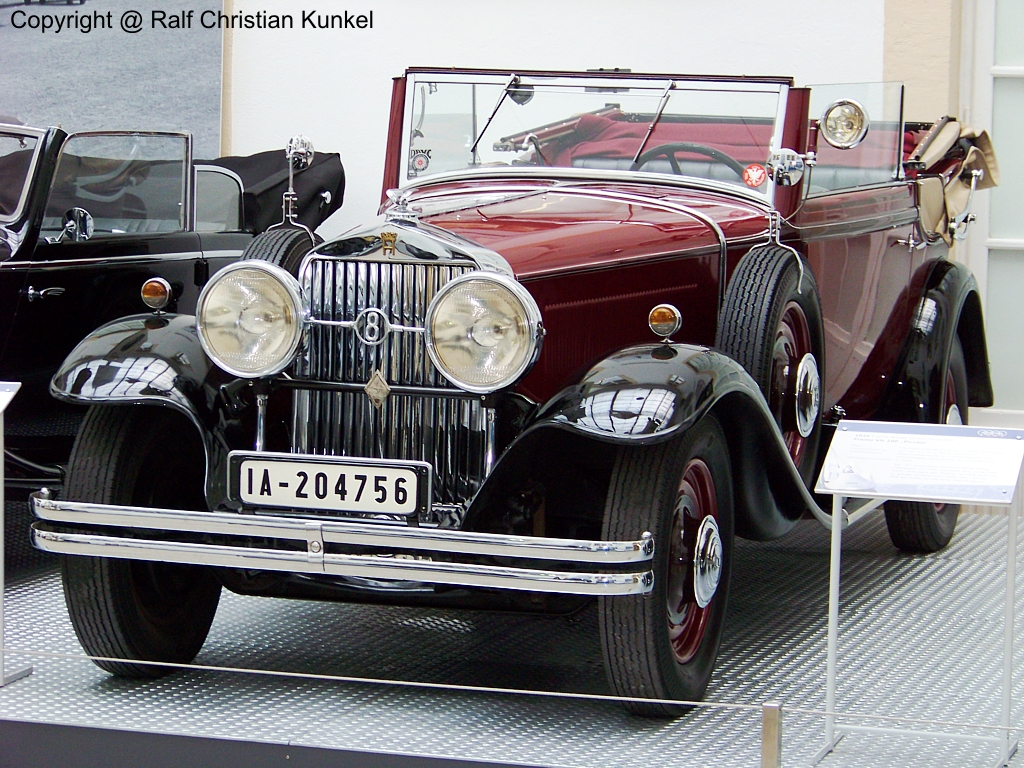 Horch 420 Cabriolet - Baujahr 1931, Hersteller: Horch-Werke AG Zwickau, Deutschland - Mit der Produktion von 1930 bis 1931 lag die Fertigung noch vor der Gründung der Auto Union. Die Baureihe 420 wurde in 256 Exemplaren gebaut. Der zuvor bei Stoewer tätige Fritz Fiedler konstruierte die Motoren des Typs 420. Das ausgestellte Fahrzeug ist eine Leihgabe der Audi Tradition, Ingolstadt. - techn. Daten: flüssigkeitsgekühlter 8-Zylinder-Viertakt-Ottomotor, Hubraum 4.517 cm³, Leistung 66 kW (90 PS) bei 3.400 U/min, Kraftübertragung mittels Einscheiben-Trockenkupplung, unsynchronisiertem 3-Gang-Getriebe und Kardanwelle auf Hinterachse, Vmax. 115 km/h - fotografiert am 08.05.2008 im Verkehrsmuseum Dresden - Copyright @ Ralf Christian Kunkel
