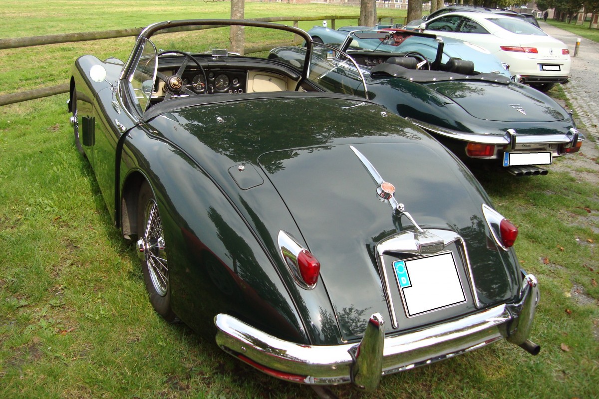 Jaguar XK 140 OTS. 1954 - 1957. Das OTS steht für O pen T wo S eater. Der Sportwagen leistet zwischen 190 PS - 210 PS aus einem 6-Zylinderreihenmotor mit 3442 cm³ Hubraum. Schloß Nordkirchen im Münsterland am 05.09.2014.