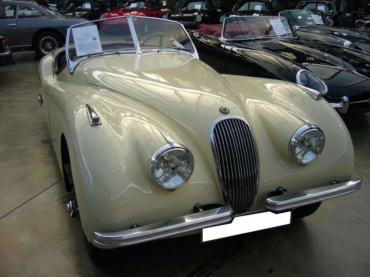 Jaguar XK 120 OTS. 1948 - 1954. Der XK 120 war das erste Modell der legendären XK Reihe von Jaguar. Es wurden ca. 10000 Fahrzeuge in den drei Karosserievarianten: OTS ( Open two seater), DHC (D rop H ead C oupe) und FHC (F ixed H ead C oupe) produziert. Der abgelichtete DHC entstammt dem Baujahr 1952. Der 6-Zylinderreihenmotor leistet 160 PS aus 3442 cm³ Hubraum. Classic Remise Düsseldorf am 20.12.2015.