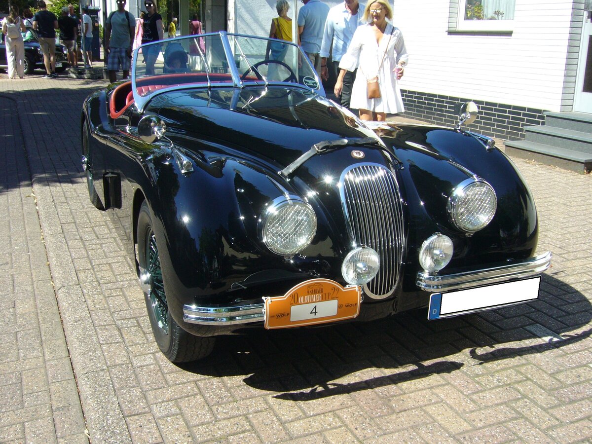 Jaguar XK 120 OTS aus dem Jahr 1953. Der Jaguar XK120 wurde in den Jahren von 1948 bis 1954 gebaut. Hier wurde ein XK120 OTS abgelichtet. Das OTS steht für O pen T wo S eater. Im Laufe der Produktionszeit kam noch das Modell FHC ( F ixed H ead C oupe) und DHC (D rop H ead C oupe) hinzu. Der im Farbton black lackierte XK120 wurde im Juli 1953 erstmalig zugelassen. Er hat einen Sechszylinderreihenmotor, der aus einem Hubraum von 3442 cm³ in diesem Fahrzeug 160 PS leistet. Je nach gewählter Achsübersetzung, soll die Höchstgeschwindigkeit zwischen 180 km/h und 210 km/h gelegen haben. 9. Saarner Oldtimer Cup am 07.08.2022.