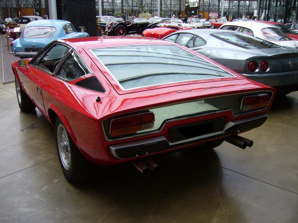 Heckansicht eines Maserati Khamsin. 1973 - 1982. Der Khamsin ist der Nachfolger des legendären Ghibli und war ebenfalls nach einem Wüstenwind benannt. Der abgelichtete Khamsin ist Baunummer 20 von 425 und stammt von 1975. Der V8-motor mit 4.856 cm³ Hubraum leistet 278 PS. Classic Remise Düsseldorf am 18.09.2011.