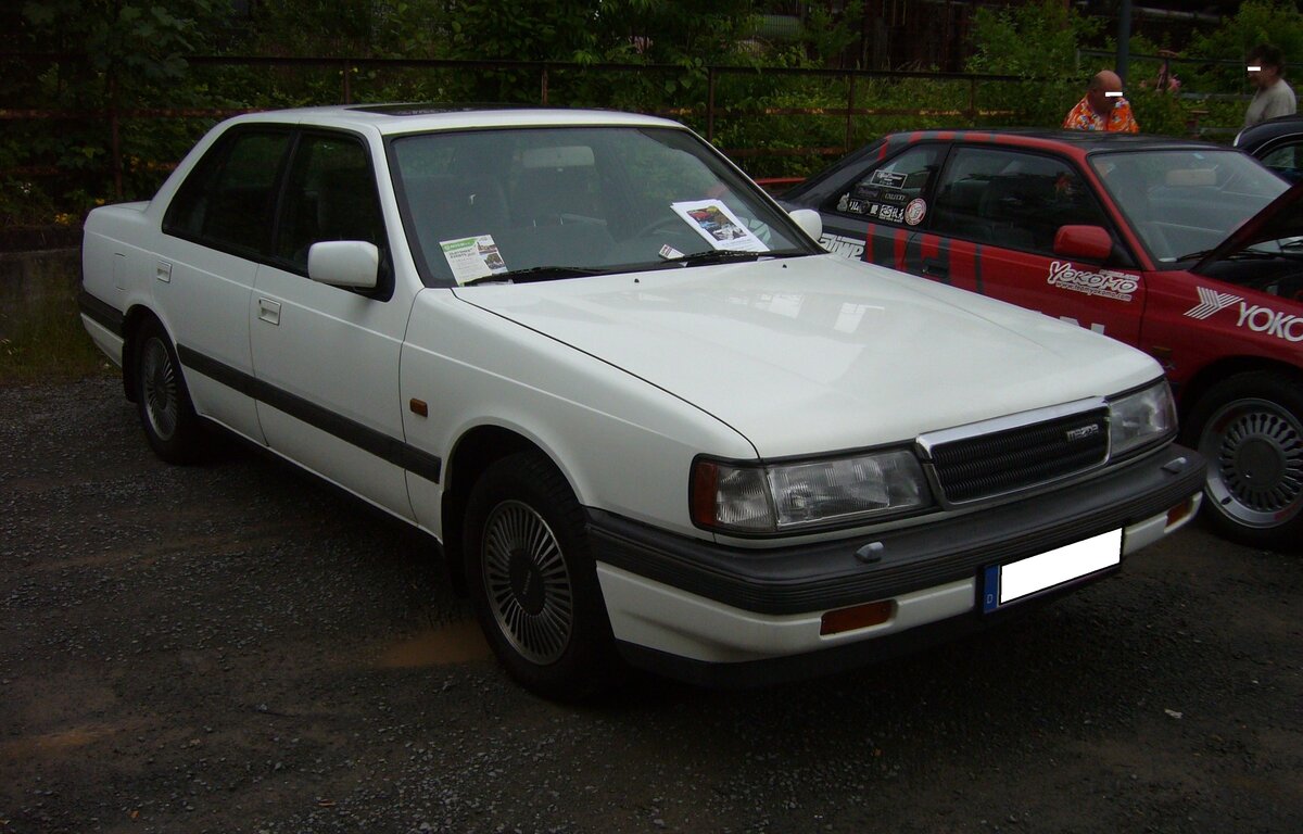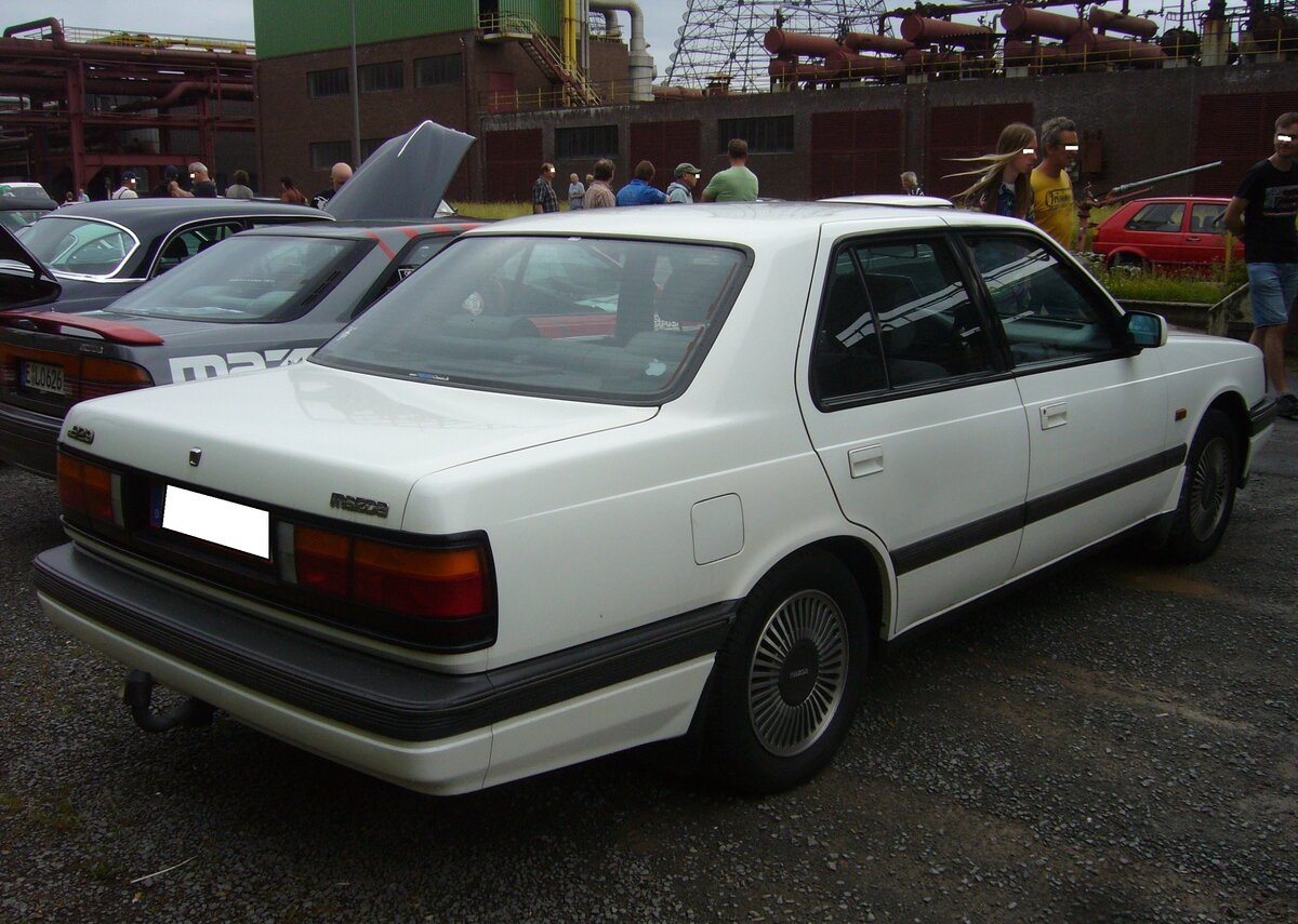 Heckansicht eines Mazda 929 GLX Coupe der Baureihe HB, gebaut von 1982 bis 1987. Mit diesem Modell zog 1982 der neue Japan-Schick in der oberen Mittelklasse ein. Der Wagen war mehr als üppig ausgestattet. In einigen Ländern konnte das Modell auch mit einem Wankelmotor geordert werden. In Deutschland allerdings nicht! Hier war das Modell ausschließlich mit einem Vierzylinderreihenmotor lieferbar, der aus einem Hubraum von 1998 cm³, wahlweise 101 PS oder 120 PS leistete. 12. Oldtimertreffen in Essen-Kettwig am 01.05.2019.