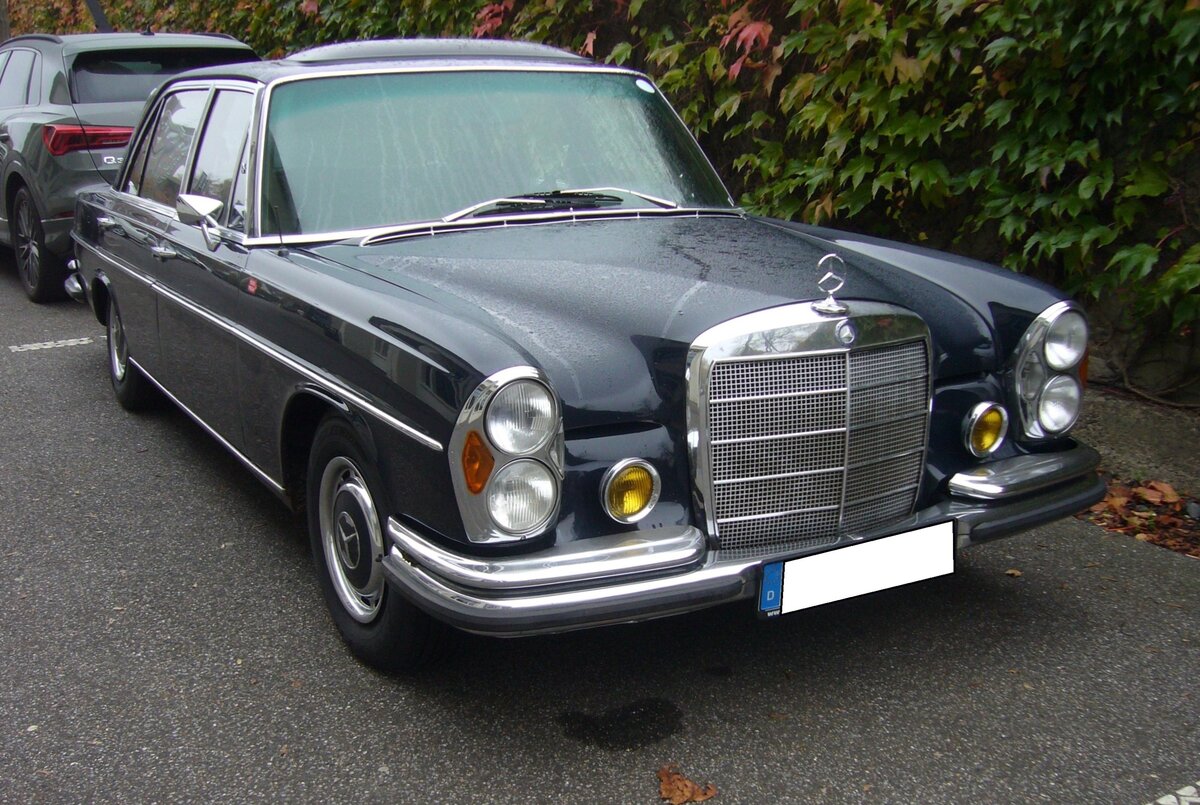 Mercedes Benz W109 300SEL 3.5, gebaut in den Jahren von 1969 bis 1972. Als Baureihe W108 250S wurde diese Karosserieform bereits 1965 vorgestellt. Im Laufe der Jahre kamen etliche Motorisierungsversion hinzu. Im September 1969 wurde der W109, das neue "Spitzenmodell" dieser Baureihe, vorgestellt. Es wurde sogar die Luftfederung vom W100 (600´er) übernommen. Der Grundpreis eines solchen Wagens lag bei seiner Markteinführung bei DM 31.025,00. Der V8-Motor hat einen Hubraum von 3499 cm³ und leistet 200 PS. Besucherparkplatz der Düsseldorfer Classic Remise am 01.11.2024.