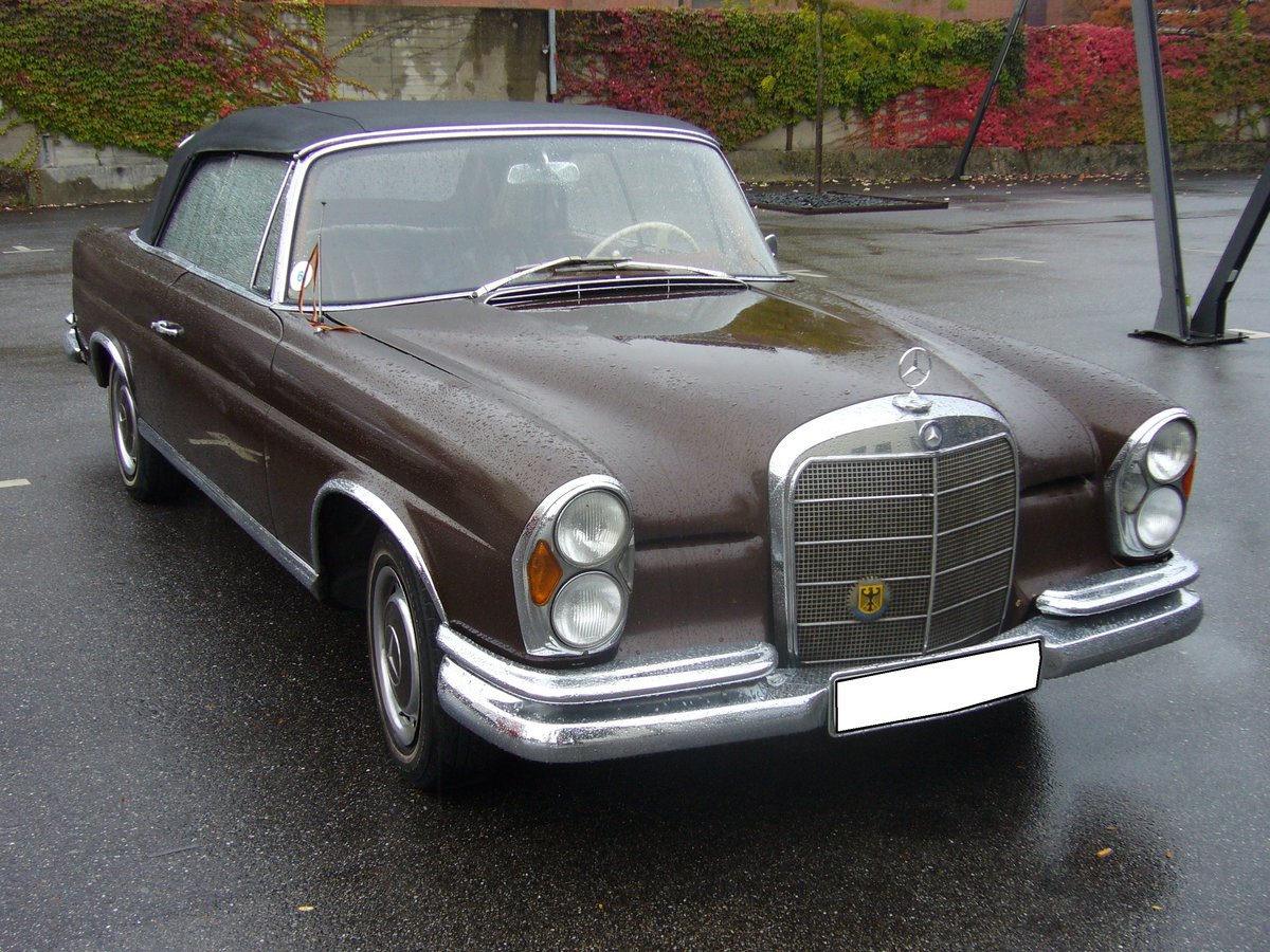 Mercedes Benz W111-3 220SE b Cabriolet, produziert von September 1961 bis Oktober 1965. Bei seinem Erscheinen stand ein solches Auto mit einem Grundpreis von DM 23.500,00 in den Preislisten der "Untertürkheimer". Angetrieben wird dieses formschöne Cabriolet von einem Sechszylinderreihenmotor, der aus einem Hubraum von 2195 cm³ eine Leistung von 120 PS erbringt. Die Höchstgeschwindigkeit wurde mit 172 km/h angegeben. Besucherparkplatz der Düsseldorfer Classic Remise im Oktober 2013.