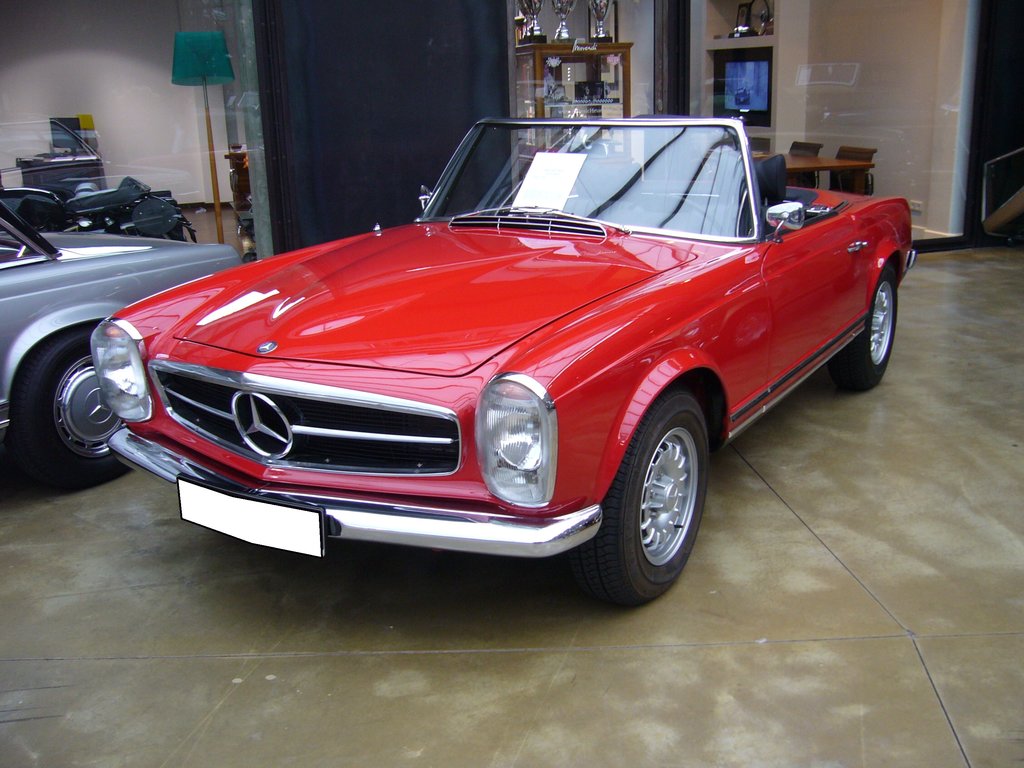 Mercedes Benz W113 230SL. 1963 - 1971. Die als "Pagodenmercedes" bekannte Baureihe kam 1963 auf den Markt. Als 230SL wurde er von 1963 - 1967 produziert. Der 6-Zylinderreihenmotor hat einen Hubraum von 2291 cm³ und leistet 150 PS. Classic Remise Düsseldorf am 30.09.2017.