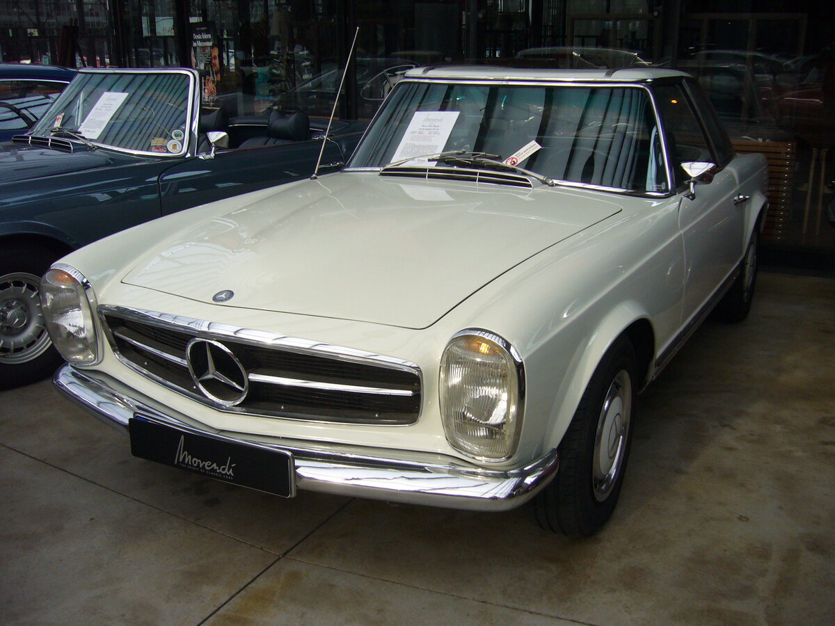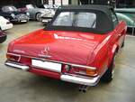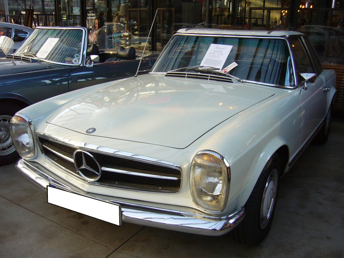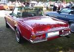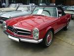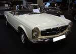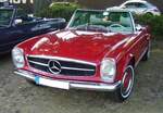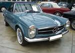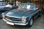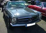 Mercedes Benz W113 230SL, gebaut von 1963 bis 1971 im Farbton grau. Die, als "Pagoden-Mercedes" bekannte, Baureihe, kam im Jahr 1963 auf den Markt. Der 230SL war in dieser Baureihe das Modell mit der schwächsten Motorisierung und stand von 1963 bis 1967 im Verkaufsprospekt der Untertürkheimer. Der Sechszylinderreihenmotor hat einen Hubraum von 2291 cm³ und leistet 150 PS. 4. Oldtimertreffen an der "Burgruine" Essen-Burgaltendorf am 14.05.2023.