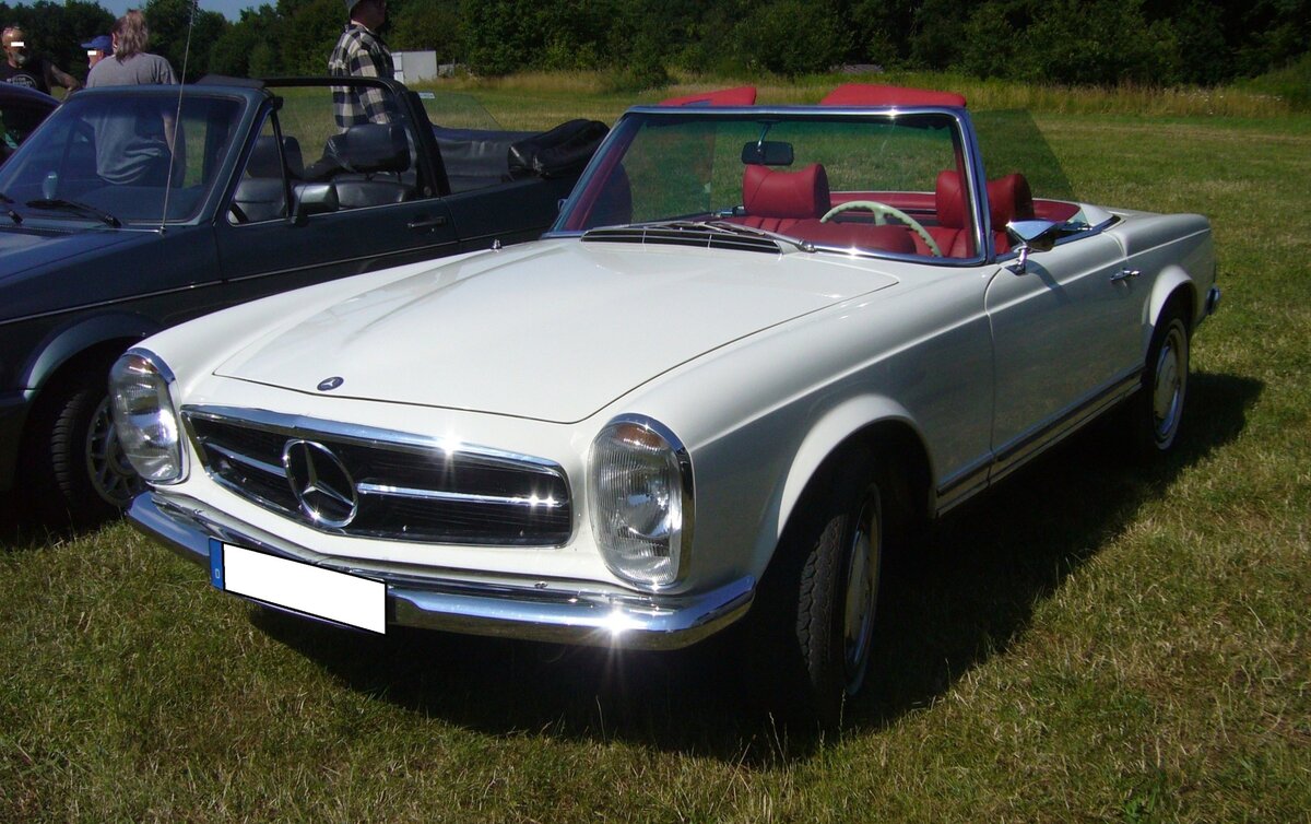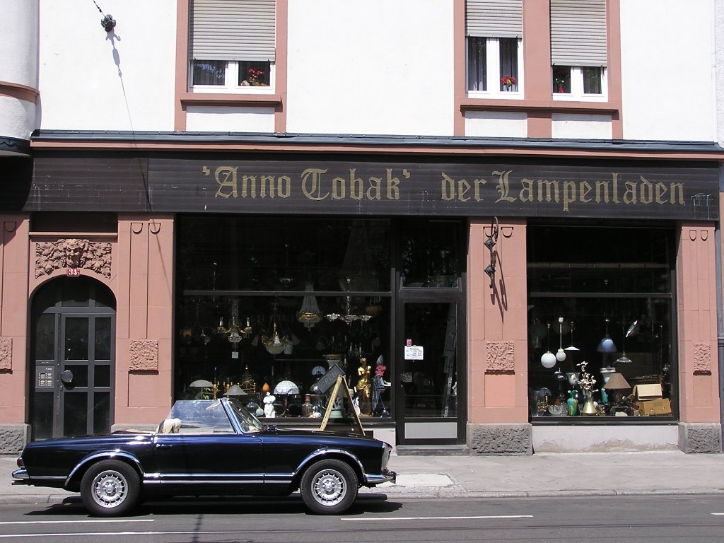 Oldtimer Mercedes stand vor einem Lampenladen. Aufgenommen: Juli 2010, Frankfur a. M.