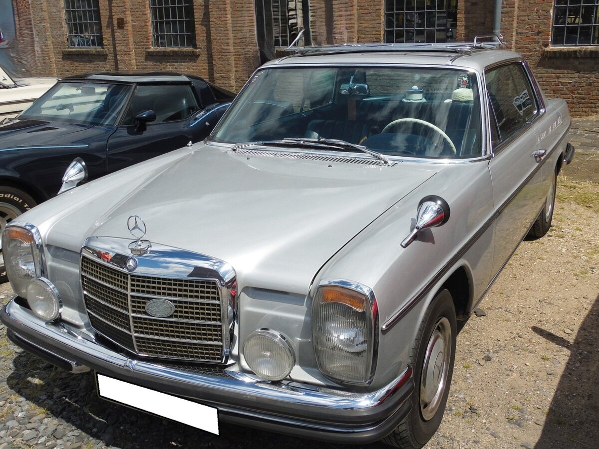 Mercedes Benz W114 280CE, gebaut von April 1972 bis zur Einstellung der Strich/8 Baureihe im Jahr 1976. Hier konnte ich ein frühes 280CE Coupe ablichten. Für ein solch elegantes Coupe war im Mai 1972 mindestens ein Kaufpreis von DM 22.980,00 fällig. Der Sechszylinderreihenmotor mit einer Bosch-Benzineinspritzung hat einen Hubraum von 2746 cm³ und leistet 185 PS. Die Höchstgeschwindigkeit gaben die Untertürkheimer mit 200 km/h an. Dann flossen aber auch bis zu 17 Liter Superbenzin auf 100 Kilometer durch die Einspritzdüsen. Oldtimertreffen an der  Alten Dreherei  in Mülheim an der Ruhr im Juni 2025.