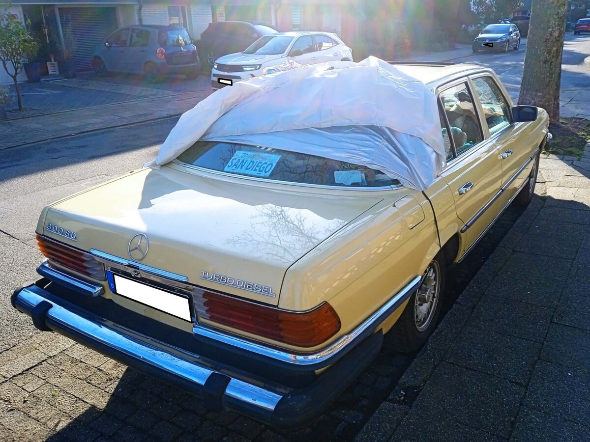 Mercedes Benz W116 300SD. Dieselnageln mit dem dieseltypischen Geräusch? Das beherrscht der Mercedes-Benz 300 SD der Baureihe 116 ganz hervorragend. Dieses W116 Modell wurde nur von 1977 bis 1980 gebaut. Der Selbstzünder 300SD galt damals als sparsam, luxuriös und komfortabel. Allerdings wurde dieses S-Klasse-Modell nur für den US-amerikanischen und kanadischen Markt produziert. Was man beim gezeigten Auto auch sehr gut an den "fetten" Stoßfängern erkennen kann. Der mittels eines Garrett-Turboladers aufgeladene Fünfzylinderreihendieselmotor hat einen Hubraum von 3005 cm³ und leistet rund 115 PS. Dank der 115 PS konnte die Limousine eine maximale Geschwindigkeit von 165 km/h erreichen und wurde mit einem Durchschnittsverbrauch von 14,1 Litern Diesel auf 100 Kilometer angegeben. Essen am 08.02.2026.