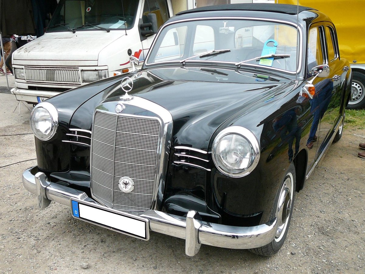 Mercedes Benz W120 180, gebaut von 1953 bis 1957. Ein solcher 180 stand bei seiner Vorstellung im Juli 1953 mit DM 9950,00 in den Preislisten der Händler. Dafür bekam der Käufer ein solides, modernes Fahrzeug mit einem Vierzylinderreihenmotor. Dieser Motor leistet aus einem Hubraum von 1767 cm³ 52 PS. Oldtimertreffen an der "Alten Dreherei" in Mülheim an der Ruhr im Juni 2015.