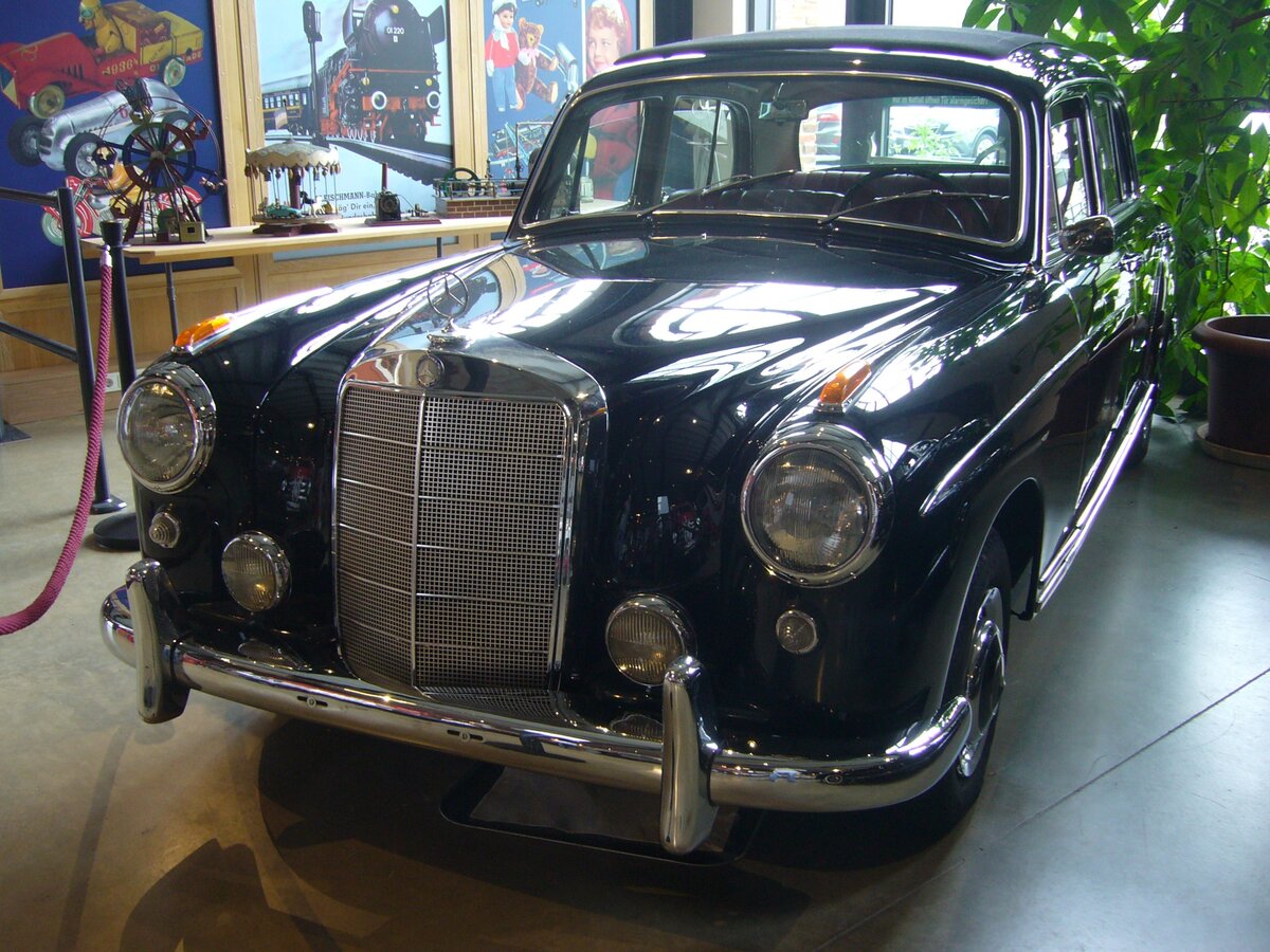 Mercedes Benz W180 II 220S Limousine. Die Baureihe W180 wurde im Jahr 1954 vorgestellt. Von der Optik her ähnelte dieses Modell dem ein Jahr früher vorgestellten W120 (Ponton). Von 1954 bis 1956 wurde der 220 produziert. Ab März 1956 wurde dann der W180 II, besser bekannt als 220S gebaut. Der W180 II war äußerlich an hübscheren Chromverzierungen zu erkennen. Insgesamt verließen 55.279 Fahrzeuge dieses Typs die Werkshallen von Mercedes Benz. Der Grundpreis für ein solches Modell betrug DM 12.500,00. Der gezeigte Wagen ist mit einem damals aufpreispflichtigen Faltschiebedach ausgestattet, das bei Sonnenschein auch eine entspannte Fahrt für die Mitfahrer im Fond möglich machte. Der Sechszylinderreihenmotor hat einen Hubraum von 2195 cm³ und leistete bis zum Juli 1957 100 PS. Danach erhöhte sich die Leistung auf 106 PS. Zylinderhaus in Bernkastel-Kues am 23.05.2024.