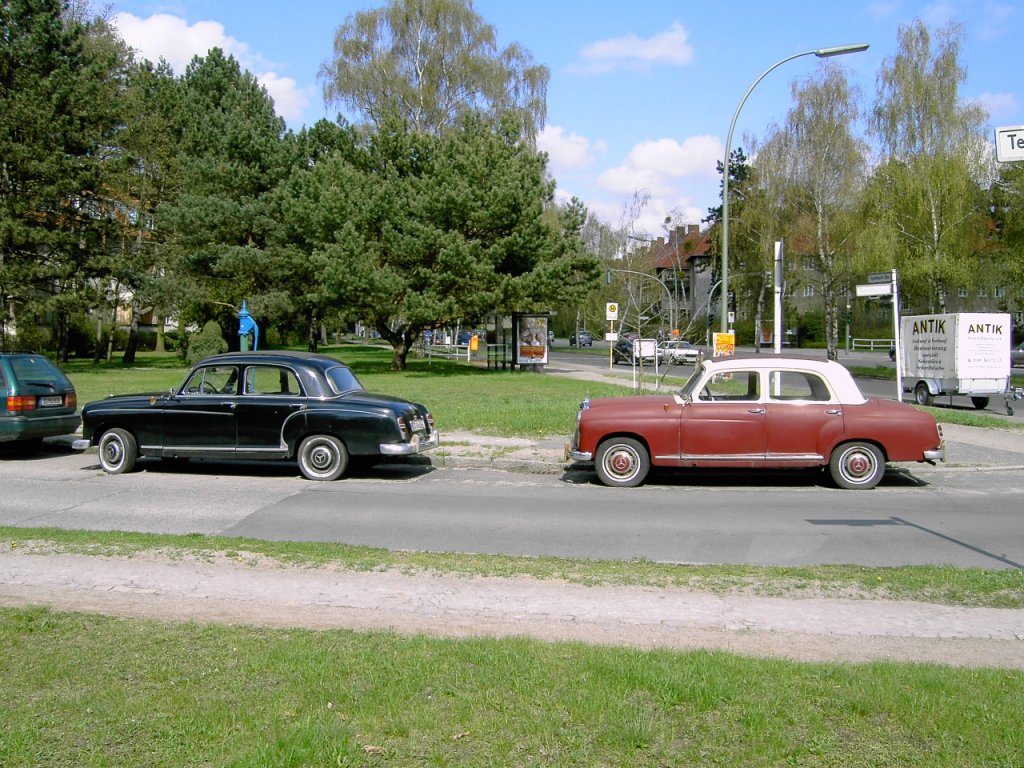 Schönes Treffen! Ein Mercedes-Benz 190 Ponton W121, links in Schwarz trifft auf ein Mercedes-Benz 180 W120, rechts im Bild, gesehen 08/2006 in Berlin.