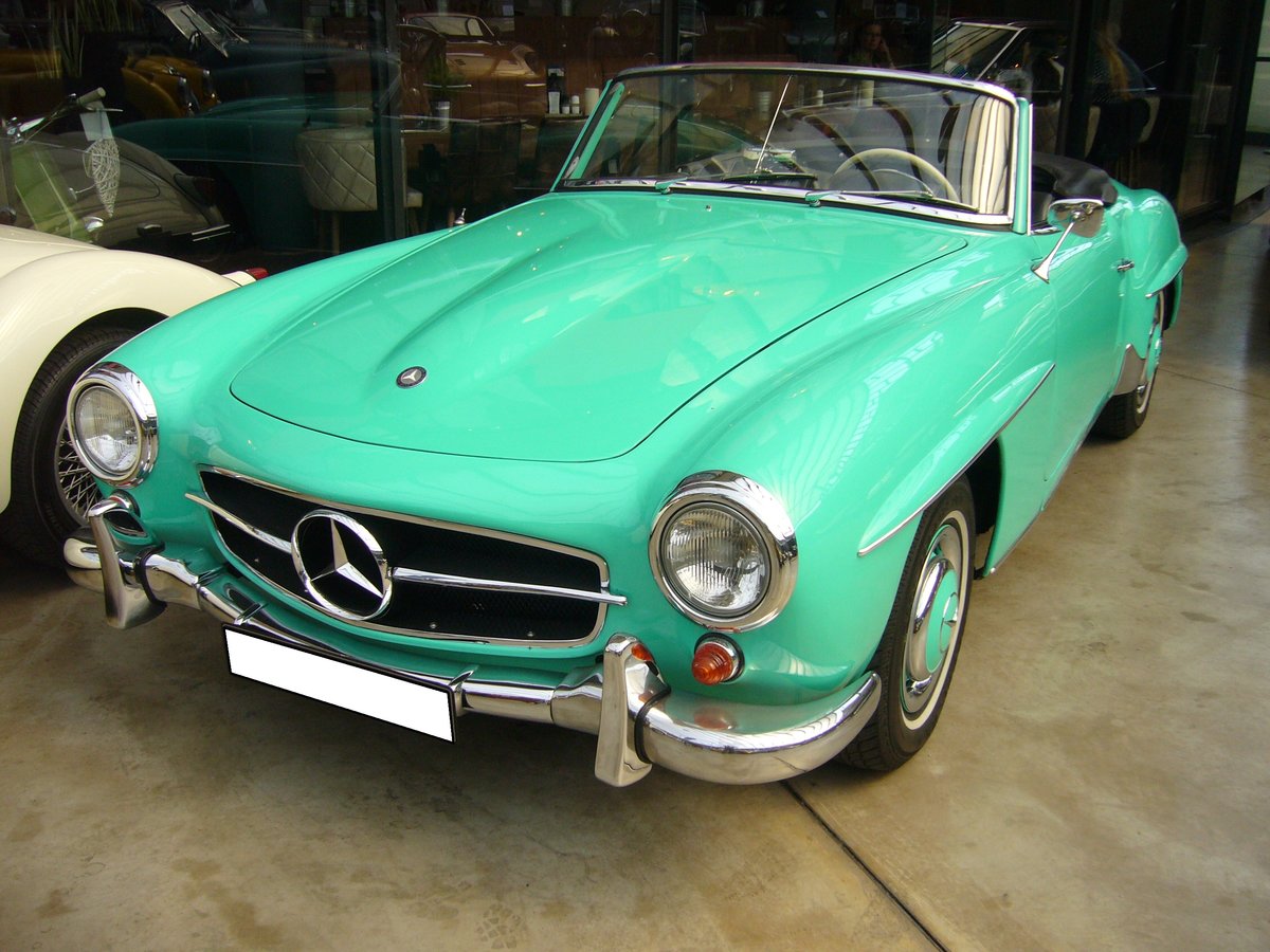 Mercedes Benz W121 BII, gebaut von 1955 bis 1963. Das Modell ist besser bekannt unter der Typenbezeichnung 190SL. Insgesamt verließen 25.881 Fahrzeuge dieses Typs die Werkshallen von Mercedes Benz. Dieser, im extravaganten Farbton türkisgrün lackierte Wagen, wurde 1959 als Firmenwagen an das Rockefeller Center New York ausgeliefert. Angetrieben wird der 190SL von einem Vierzylinderreihenmotor der aus einem Hubraum von 1897 cm³ eine Leistung von 105 PS an die Hinterachse wuchtet. Als Höchstgeschwindigkeit für dieses Modell gaben die "Schwaben" 173 km/h an. Classic Remise Düsseldorf am 23.05.2019.