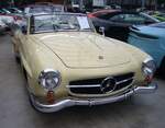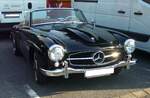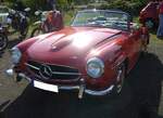 Mercedes Benz W121 B II, gebaut in den Jahren von 1955 bis 1963. Dieser Sportwagen ist besser bekannt unter der Typenbezeichnung 190SL. Genau 25.881 Fahrzeuge dieses Typs verließen die Werkshallen von Mercedes Benz. Dieser 190 SL ist im Farbton DB 534 feuerrot lackiert. Der Vierzylinderreihenmotor mit einem Hubraum von 1897 cm³ leistet 105 PS. Für einen solchen  Wirtschaftswunder-Sportwagen  war mindestens ein Kaufpreis von DM 16.500,00 fällig. Ab September 1959 konnte der Kunde bzw. die Kundin ein festes Hardtop-Coupedach mit bestellen, um im Winter ein festes Dach über dem Kopf zu haben. 11. Oldtimertreffen des AMC Duisburg auf dem Parkplatz des Landschaftspark Duisburg Nord am 24.08.2025.