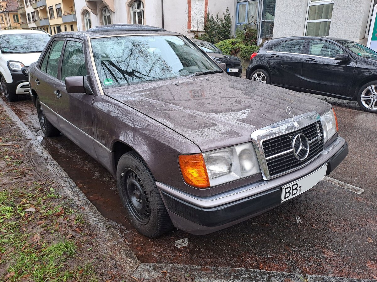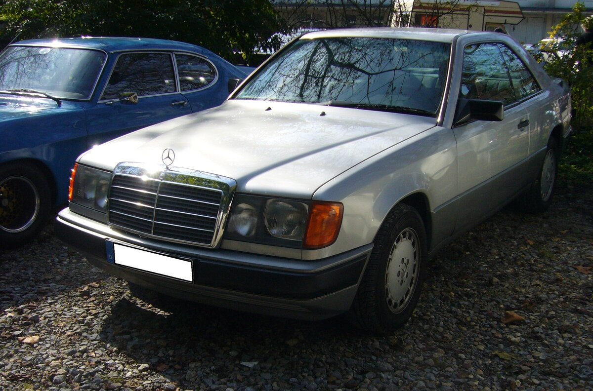 Mercedes Benz C124 220E. Während die Mercedes Benz W124 Limousine bereits Ab November 1984 ausgeliefert wurde, ergänzten die Untertürkheimer die Modellpalette um das Coupe erst im Frühjahr 1987. Da die Seitenbeplankung farblich auf die Lackierung dieses Coupes angepasst ist, kann man davon ausgehen das es ein Auto ist, das nach September 1989 aufgeliefert wurde. Insgesamt verließen 141.498 Coupes dieser Baureihe die Werkshallen von Mercedes Benz (alle Motorisierungen zusammen genommen). Der Vierzylinderreihenmotor des E220 hat einen Hubraum von 2199 cm³ und leistet genau 150 PS. Die Höchstgeschwindigkeit soll rund 210 km/h betragen. Oldtimertreffen am Cafe del Sol in Gelsenkirchen am 12.10.2025. Michael H.