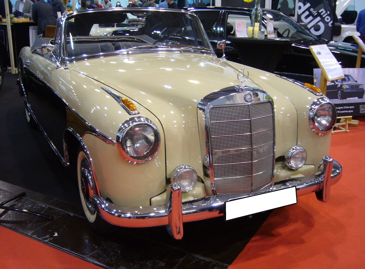 Mercedes Benz W128 220SE Cabriolet in der Farbkombination elfenbein über schwarz aus dem Jahr 1958. Produziert wurde das Modell von Oktober 1958 bis November 1960 in 1112 Einheiten. Ein solches Cabriolet schlug bei seiner Markteinführung mit einem Kaufpreis von mindestens DM 23.400,00 zu Buche. Dafür bekam der Käufer ein formschönes Cabriolet, das mit einem Sechszylinderreihenmotor ausgestattet ist. Aus einem Hubraum von 2195 cm³ leistet der Wagen 115 PS. Die Höchstgeschwindigkeit lag bei 160 km/h. Techno Classica Essen am 05.04.2024.